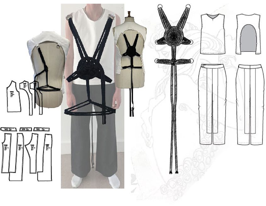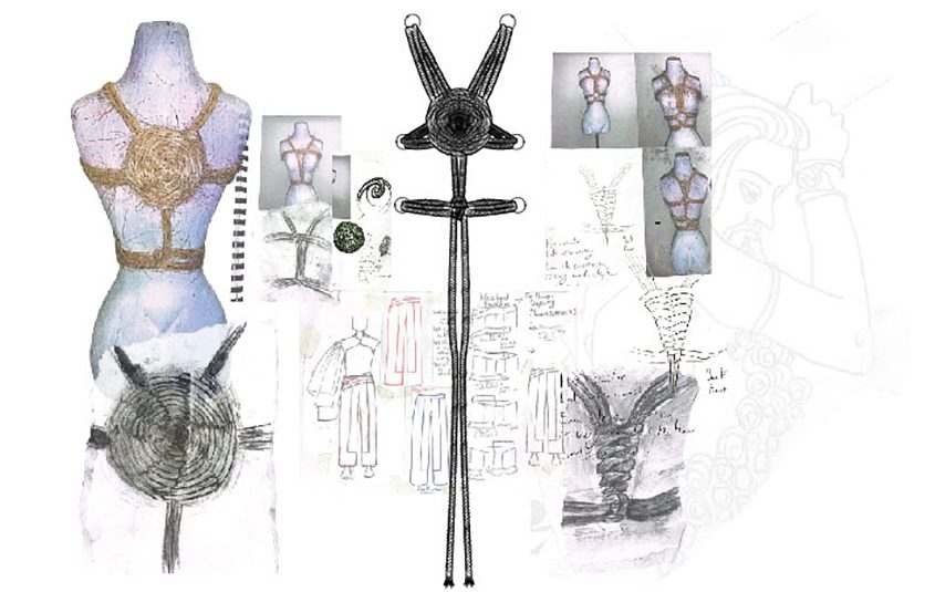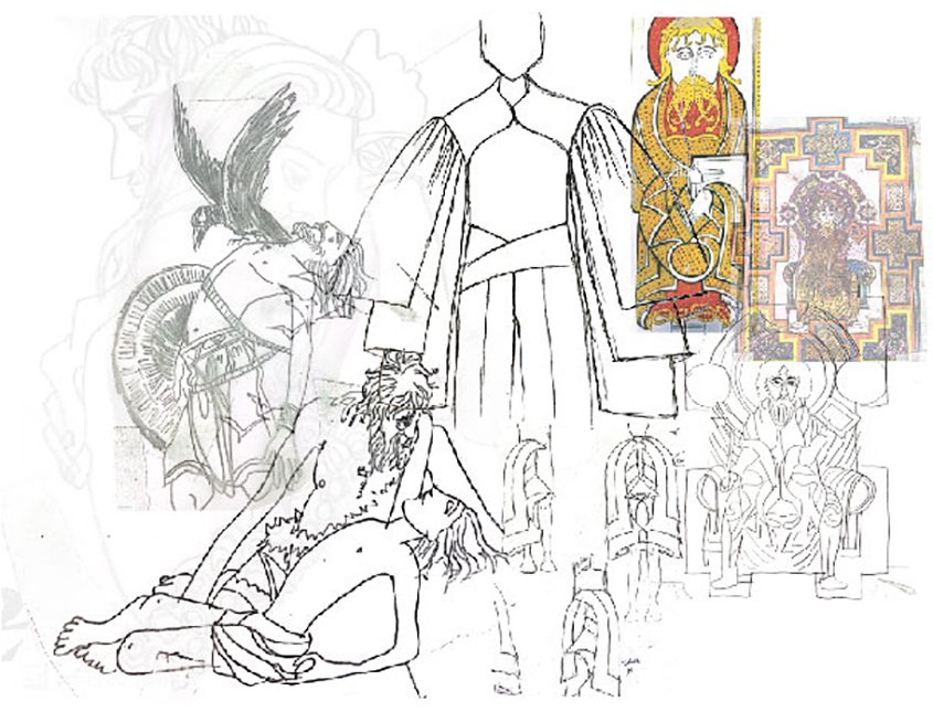 My final collection is focused on a folklore I am very fond of, the life and legacy of Cuchulainn, one of Irelands greatest warriors.  During my research into his life, I stumbled across the tale of Cuchulainn and Aoife’s son.  It is a story that leaves a bittersweet taste, as an unavoidable tragedy occurs as forcing Cuchulainn to kill his son with his own hands.  To achieve my silhouettes, I used “The Book of Kells” as the base for my designs.  While studying the pages, I recreated some of the repeated line art and symbols using knots and shibari techniques.  I used a soft rope for the knotting as there is a tenderness to the story that I didn’t want to lose by using a stiff rope.  As I was designing, I intentionally created pieces without closures, such as zips as I wanted to keep it as authentic to the time by excluding the more modern closures.  As the story begins to unfold the knots on the looks begin to loosen.  The rope will gradually get looser to represent the loss of his so, until the final knot is undone, and he is left alone.