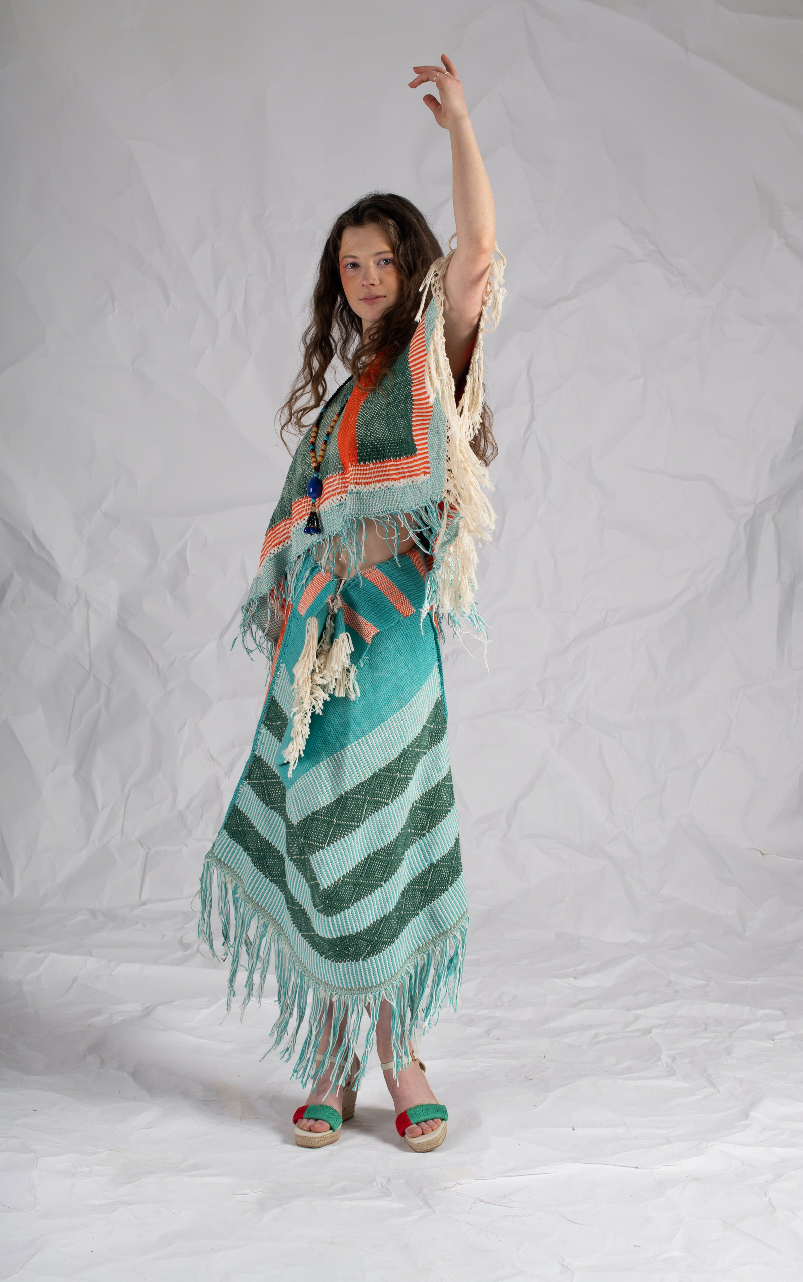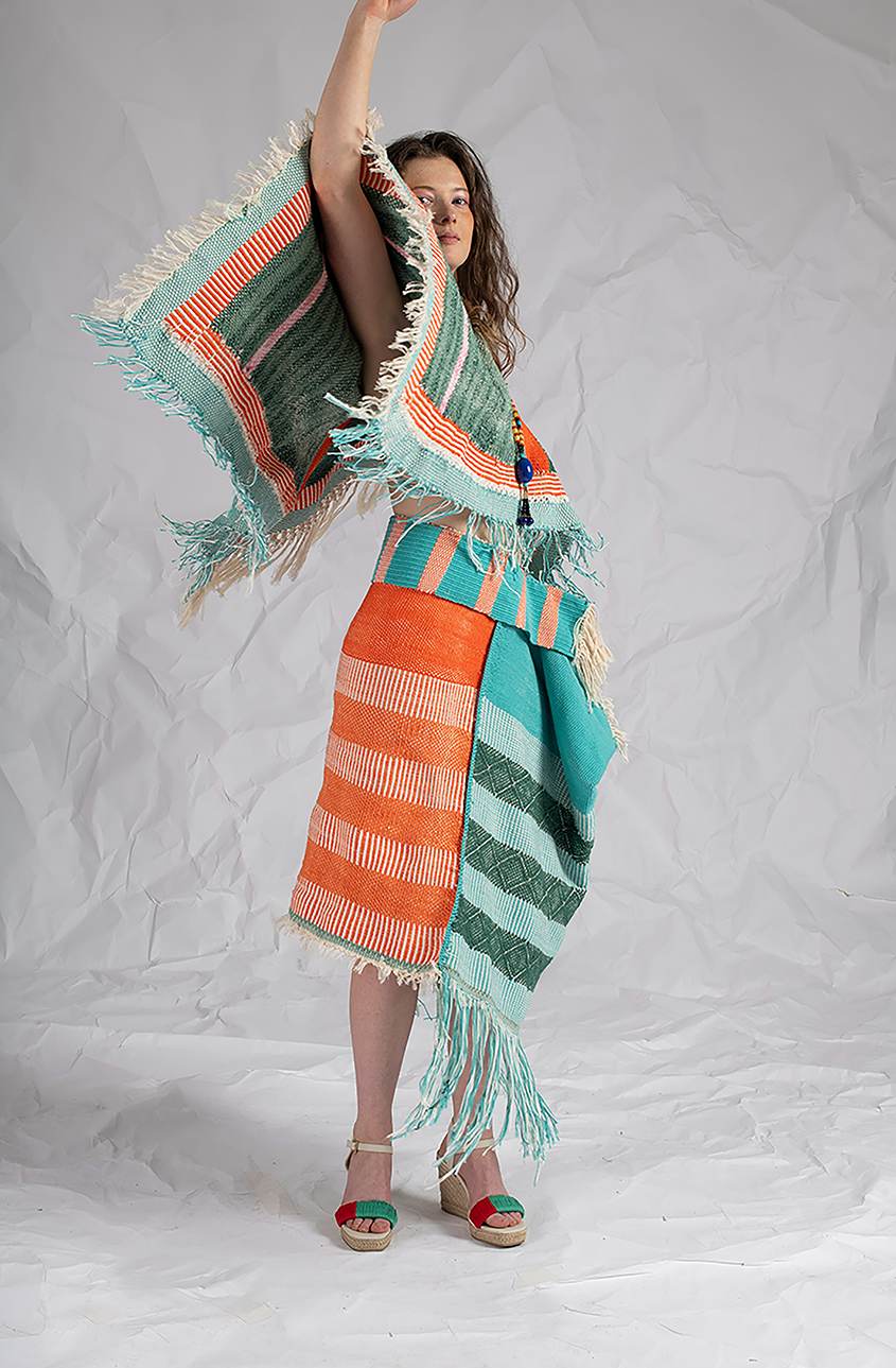 For my 4th year final year project work I was tasked with designing a minimum of 4 looks, supported by and developed from 2D and 3D developments that are undertaken throughout the processMy inspiration came from my sister’s embroidery fabric that she made before she passed away. During my holiday in Mali, I came across this fabric that she gave to my older sisters. This gave me ideas for my design, so I decided to rework her designs by crocheting and knitting. However, in the end I decided to use weaving as my focus and technique and used knitting and crochet throughout the designs as an add on. All my designs are based of my sister’s embroidery fabric, which consists mainly of diamond shapes and stripe patterns. My collection consisted of 5 different looks, the 1st one was fully crochet. A skirt with stripe pattern and the top with diamond shape. For my second look everything was weaved, I made a skirt and top again. This time both patterns were on all garment. My 3rd look was a dress made using weaving with stripe pattern and macrame on the side. The 4th design was a top made using weaving and a skirt using crochet, all stripe patterns using different colour. My final look was a long skirt that was knitted using my diamond shape design on a punch card, as for the top I weaved a poncho.