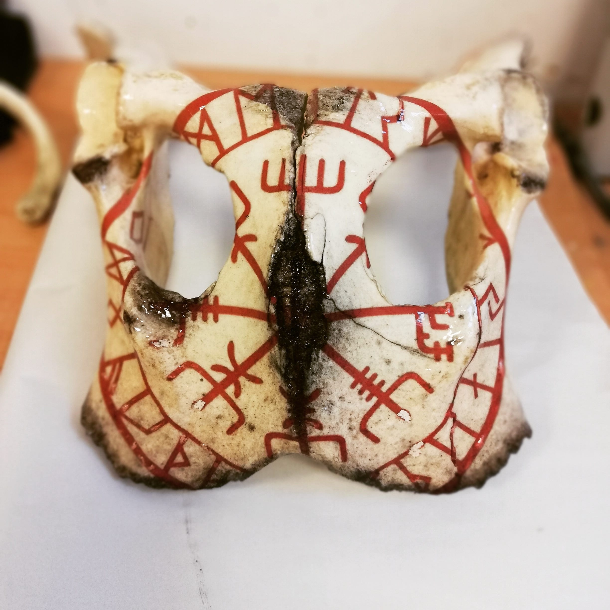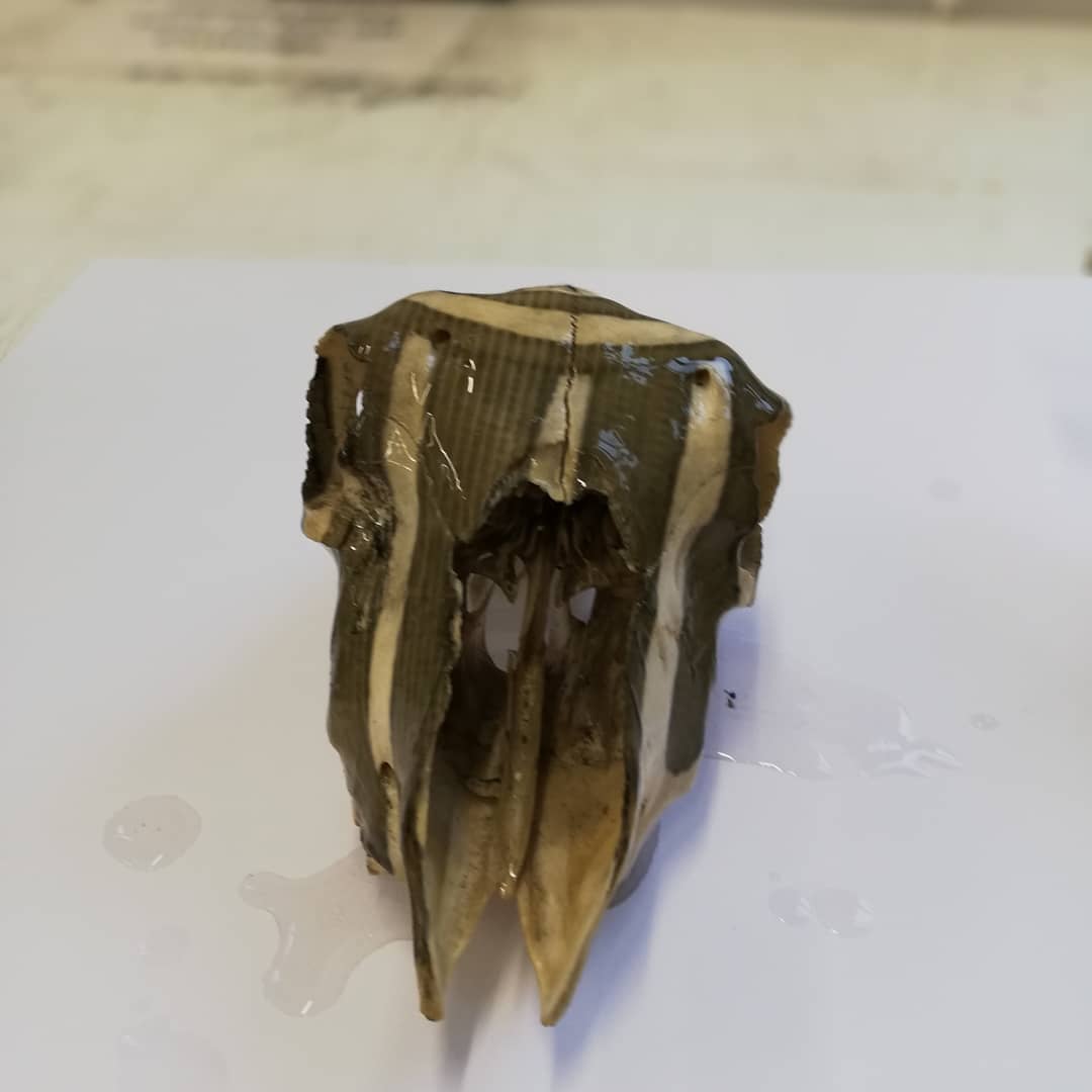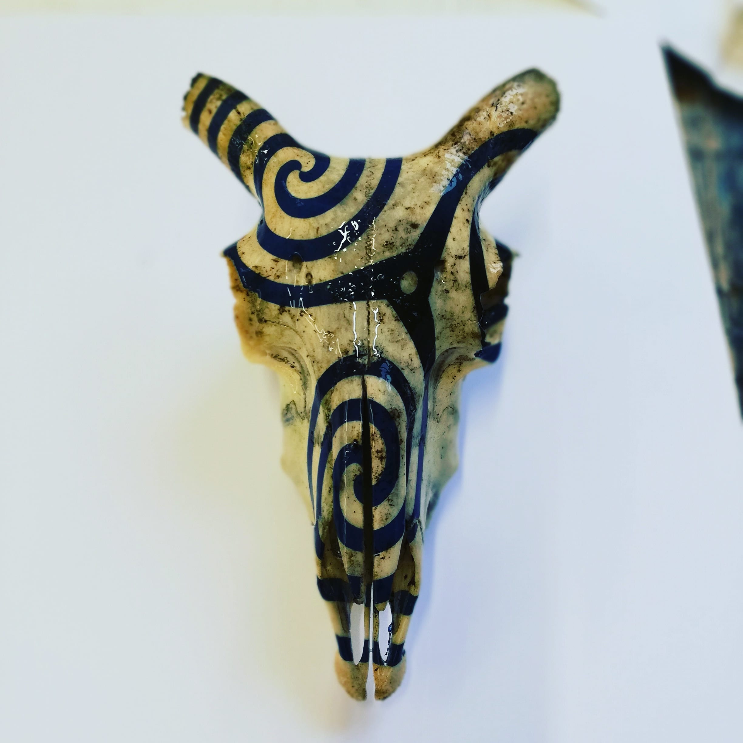Daniel Trussell lives in Feakle, Co. Clare. Currently in his fourth year studying print and contemporary practice at Limerick School of Art and Design. Daniel uses the mono print, linocut, etching and silkscreen processes to create works inspired by nature, the elements and our relationship with them. Daniel’s work looks at traditional shamanic practices from around the globe, and the ritual objects and symbolism used by Shamans in their sacred rites. The masks that shamans employ are of specific interest to him, and so he created a mask by using objects he has found in nature to create a mask fit for a Shaman. Using bone and an antler to make a mask that conveys a sense of the shamans alleged transformation into the embodiment of the elements and nature. The symbol printed on the mask is the Sámi peoples spirit compass symbol. He has also been making mono prints of Shamans masks and hydro printing on animal skulls and carved bone.