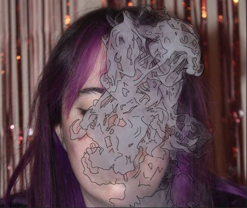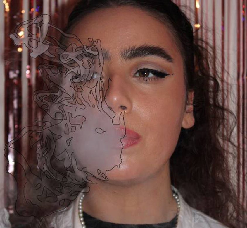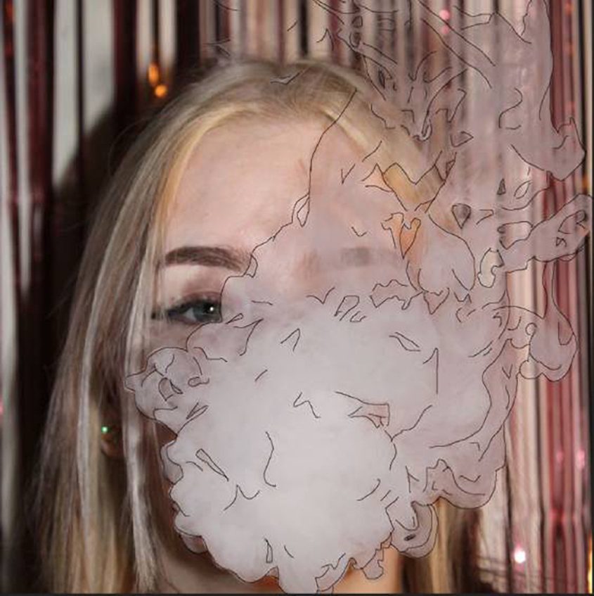 This series of work comes post covid, with the introduction back into society and into social settings. This series of work makes references through the medium of vaping and also creates references to ecoplasm. It is the method of capturing a moment and documenting a social interaction post covid. Using vaping as a medium and playing with the unpredictablity and density of the smoke, creating a dense mask over the model. Whilst photographing in the intimate setting, the smoke clouds the face and moves in an unpredictable way, making this a repetitive process trying to capture and document. Using the method of drawing back into the images added an extra layer of detail to the piece. Looking back at the piece whilst working on, new lines or shapes that hadn’t been there before would come to light. With the drawing in place, you are given all those tiny tedious details.