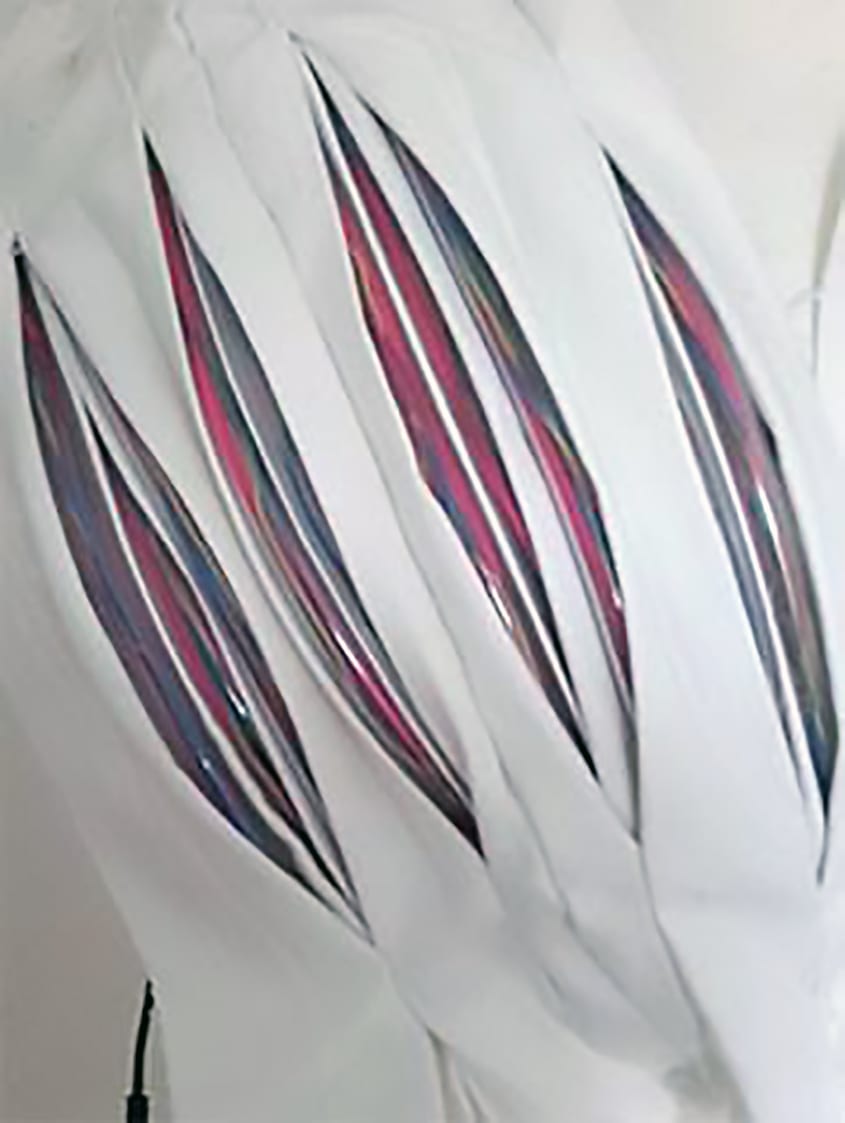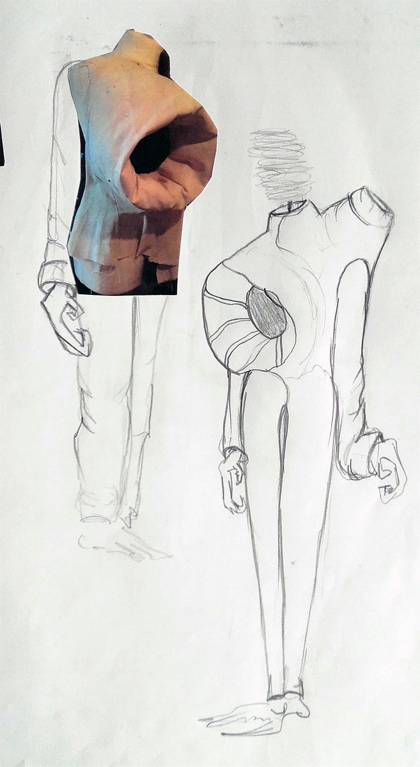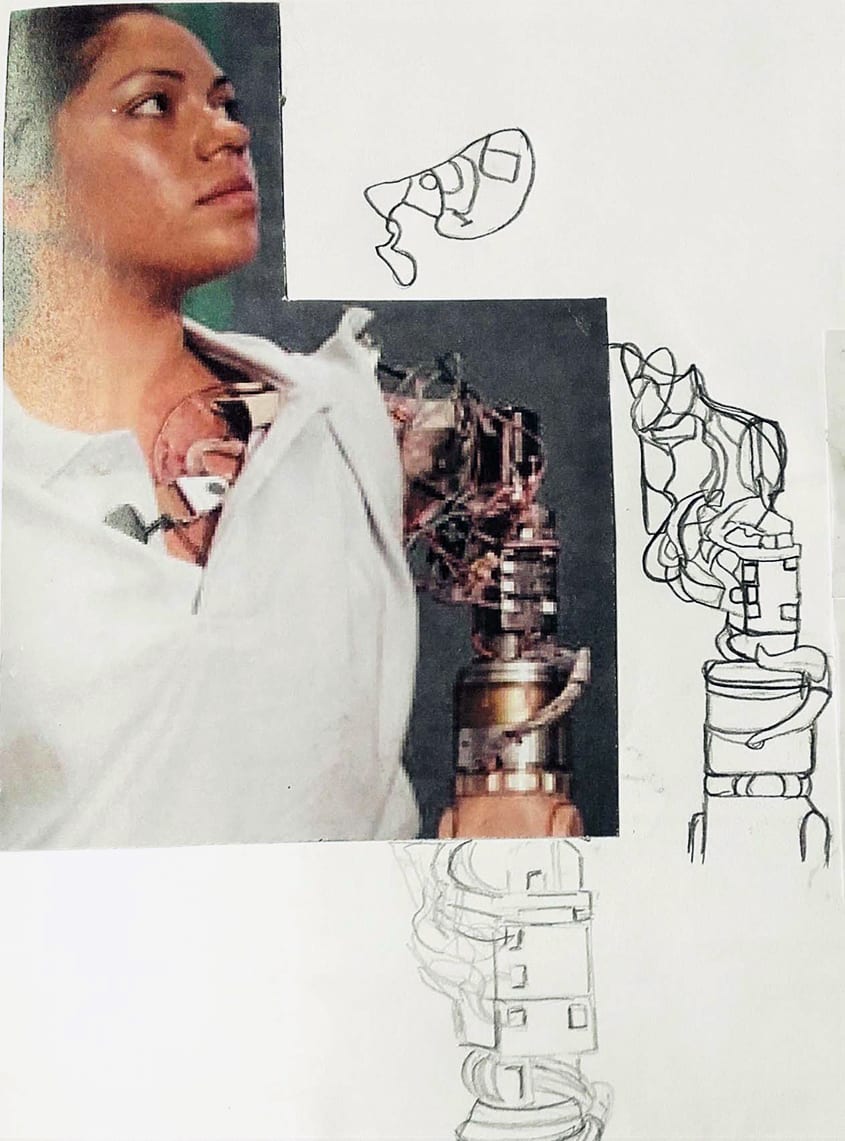 My collection is based on true story of a US Marine who lost her arm Claudia Mitchell. Using new innovative technology surgeons transplanted nerves from her arm into her chest. When the prosthetic arm is attached it is controlled by her brain. Making her the first Bionic Women. My first three looks are based on her prosthetic arm and the technology that controls it. My spec inspiration comes from the prosthetic arm as it is extended from her body. The following three outfits signifies the physical and emotional trauma caused by losing a limb. As humans when something happens to our physical appearance we see it as being magnified. I created this inner emotion through my garments. The fabrics (spec) symbolise the biology and the texture/wires and LED lights symbolise the technology. As the collection unfolds the technology becomes one with the biology. Human and Machine.