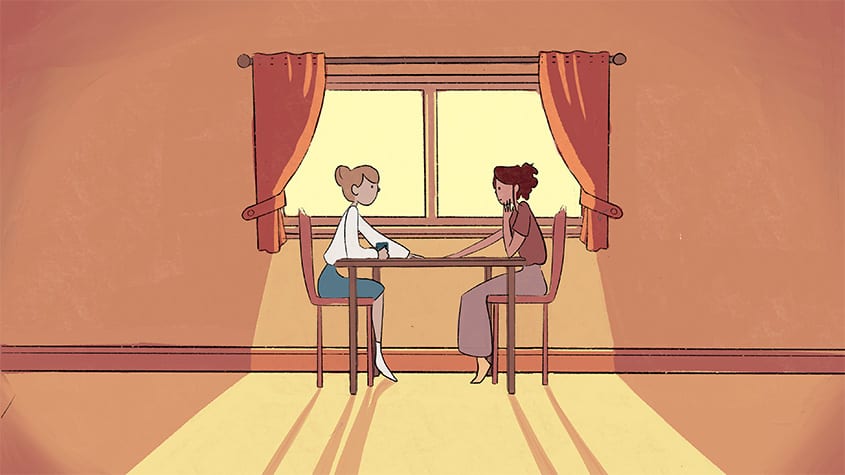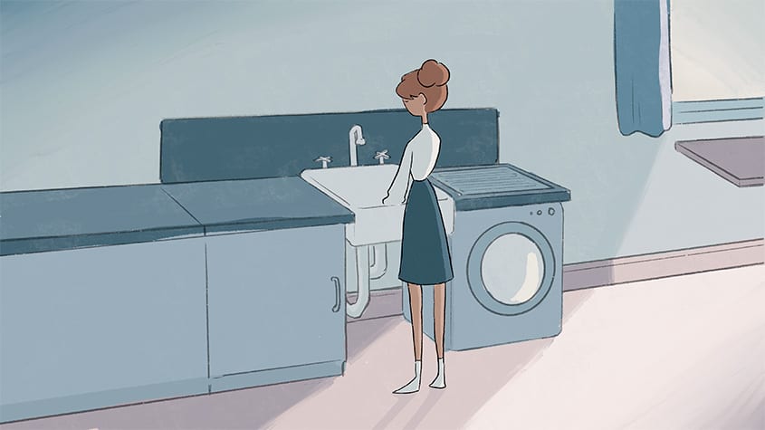 The Space Between Us follows a woman as she navigates everyday life in the absence of her other half. Life alone is quiet and empty- until her other half returns, filling her surroundings with colour.