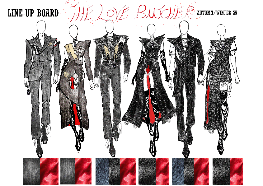 As these characters interact with one another, their entwinement is portrayed through the dissection, deconstruction and intermingling of garments symbolic of each of these subcultures; the business suit, stockings, denim jeans, bondage wear and the Perfecto biker jacket.