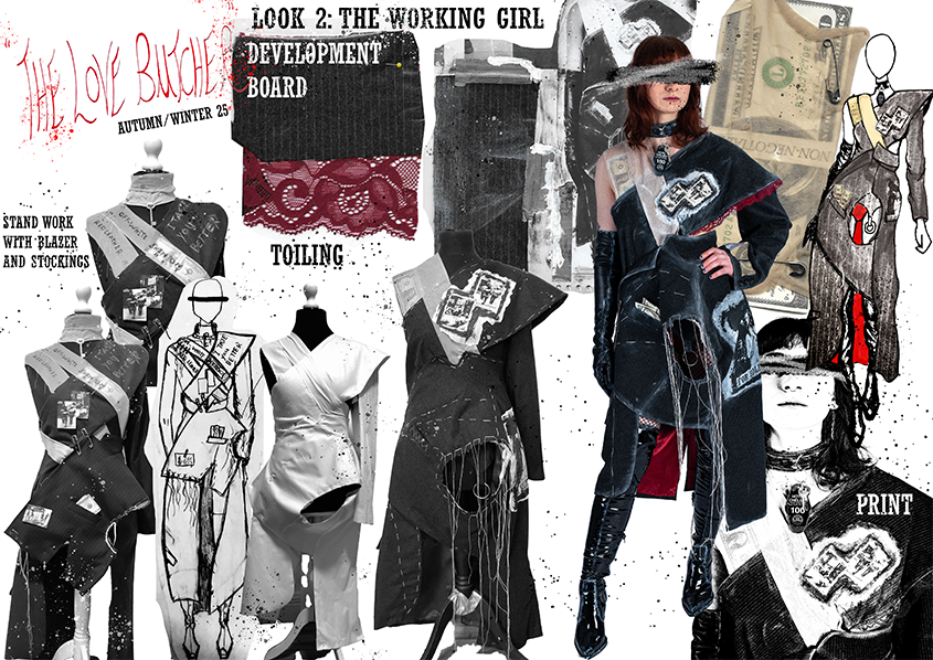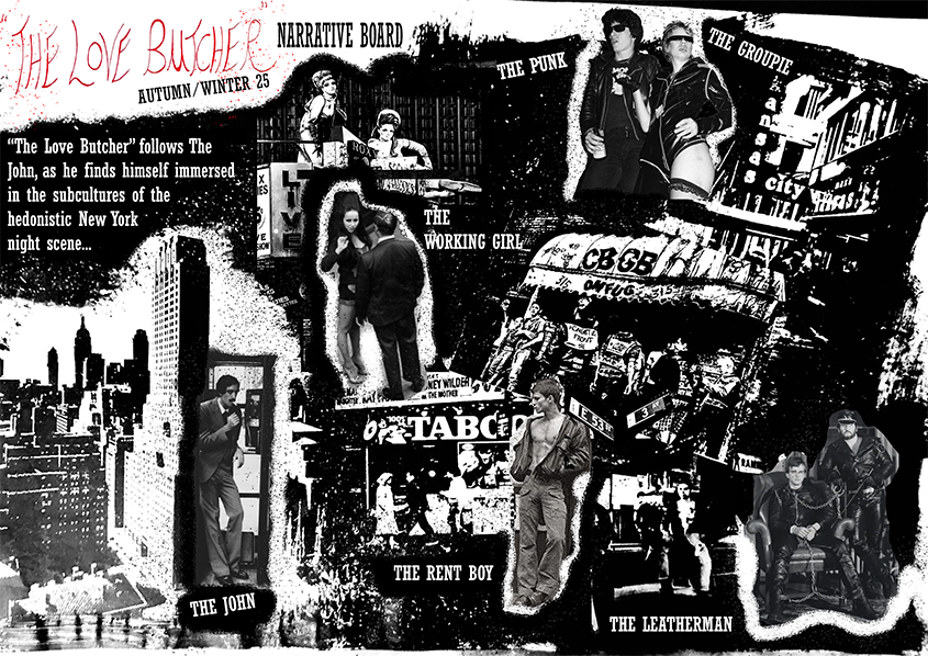 My collection is an immersion into the subcultures of 1970’s/80’s New York City, namely the sex trade, the gay leather/BDSM scene and the Punk scene. Each look in the collection is representative of a character typical of each scene; The John, The Working Girl, The Rent Boy, The Leatherman, The Punk, and The Groupie. I decided to make two womenswear looks and one menswear look out of my line-up.