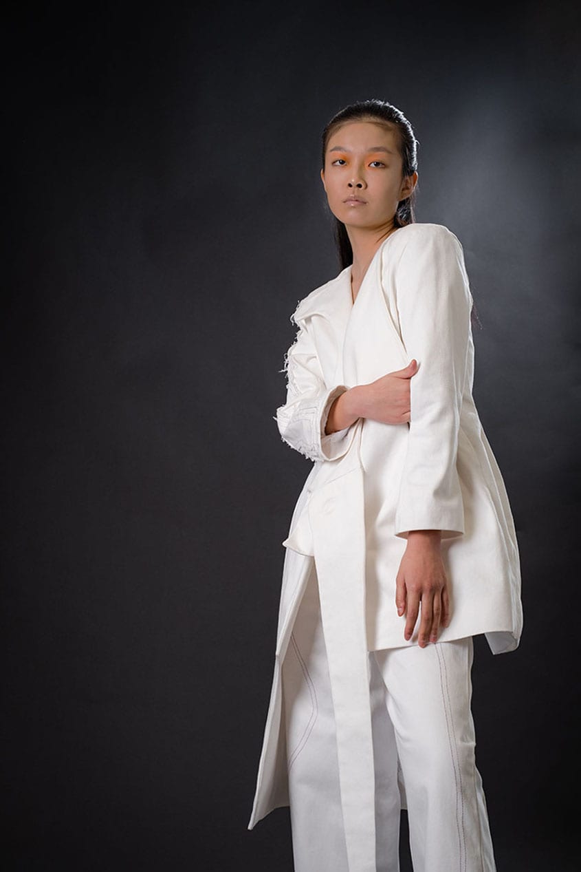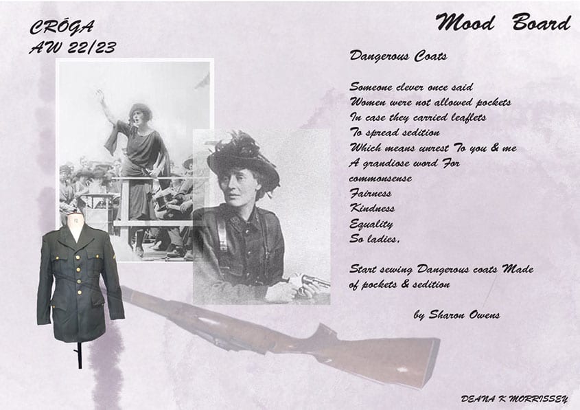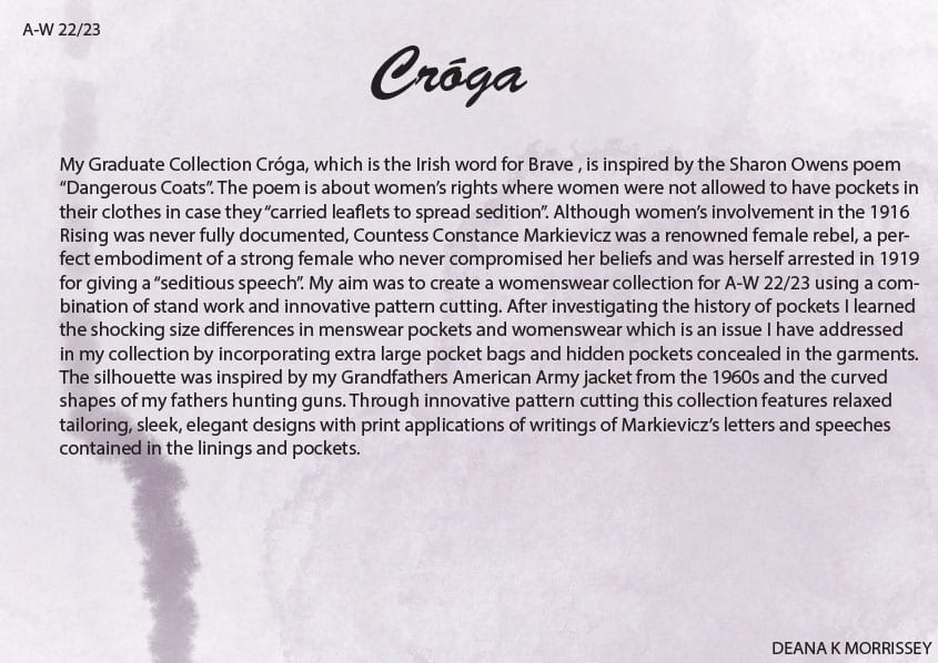 My Graduate Collection Cróga, which is the Irish word for Brave, is inspired by the Sharon Owens poem “Dangerous Coats”. The poem is about women’s rights where women were not allowed to have pockets in their clothes incase they “carried leaflets to spread sedition”. Although women’s involvement in the 1916 Rising was never fully documented, Countess Constance Markievicz was a renowned female rebel, a perfect embodiment of a strong female who never compromised her beliefs and was herself arrested in 1919 for giving a “seditious speech”. My aim was to create a womenswear collection for A-W 22/23 using a combination of stand work and innovative pattern cutting. After investigating the history of pockets, I learned the shocking size differences in menswear pockets and womenswear which is an issue I have addressed in my collection by incorporating extra-large pocket bags and hidden pockets concealed in the garments. The silhouette was inspired by my Grandfathers American Army jacket from the 1960s and the curved shapes of my fathers hunting guns. Through innovative pattern cutting this collection features relaxed tailoring, sleek, elegant designs with print applications of writings of Markievicz’s letters and speeches contained in the linings and pockets.