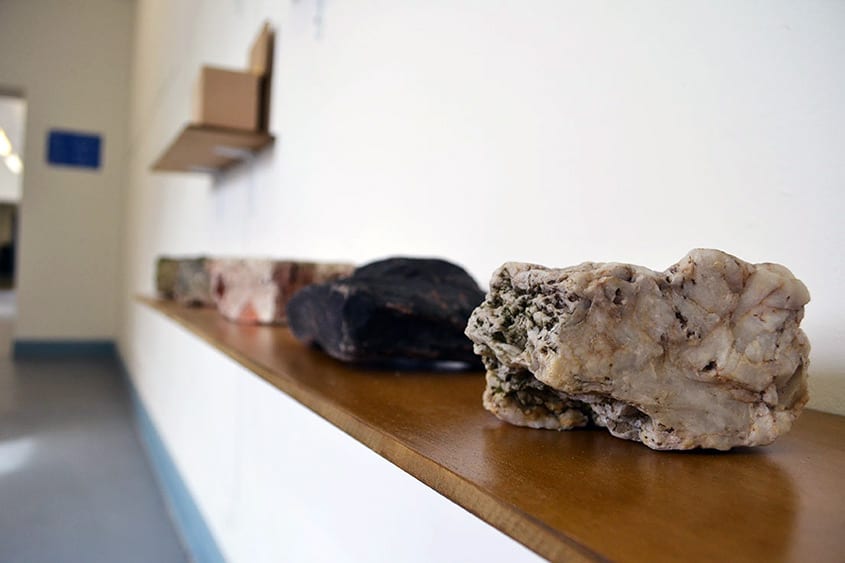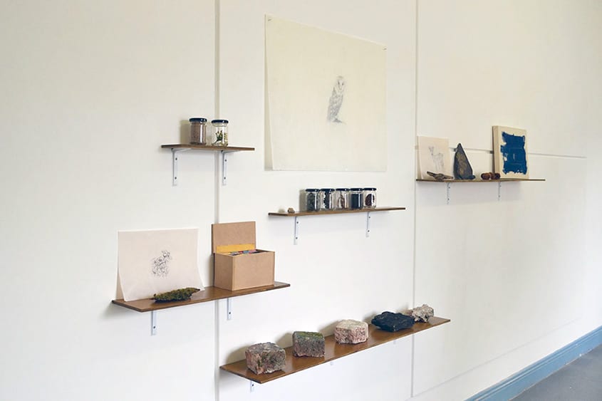 This work is a documentation of my walks, excursions and experiences in nature through the use of collected found objects and imagery from said walks. The beauty of nature is something I wish to examine, to comment on and to highlight to others. I attempt to do this by examining notions of ecology, geology and zoology. These fields of study also relate to how I display my collections. In using the shelf, museum ideologies come into play. Drawing on the ideals of Cabinets of Curiosities and Wonder Rooms – whose purpose was collecting various items of interest and the preservation and appreciation of these objects. The use of the shelf is a very deliberate and direct method of displaying found objects and imagery alongside each other. There is a sense of order and control as the viewer is guided around the space.