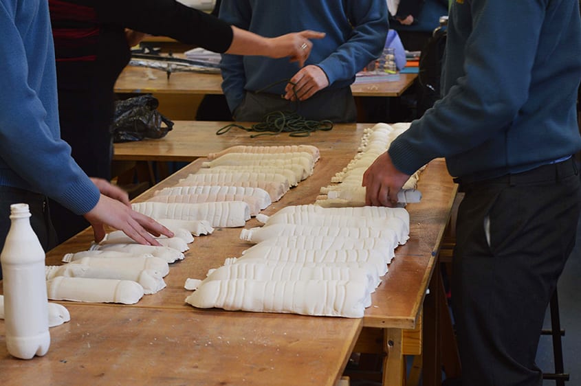 This project set out to explore ways of embedding Education for Sustainable Development concepts into the art practice of the students at Senior Cycle. It provided opportunities for students to challenge attitudes to consumerism, waste management in their own environment and respond in a creative way to these issues that affect everyone. The students took part in a guided visit to Limerick Docks, undertook an investigation of school waste management system and explored the work of artists who address Education for Sustaiable issues through their work. The students made molds of the most common item found in the bin, the plastic bottle, by casting multiples of different types of bottles in clay which were supsequently bisque fired. They then identified an appropiate location wihtin the school to locate a collaboratively designed installation. During the design and installation process they conducted interviews to record the reactions of staff and others students, to both the topic under investagation and their findings. Images of the process and background research work under taken by the students was uploaded to the school website and streamed on monitors within the school, extending the audience and presenting of the project in its entirety.