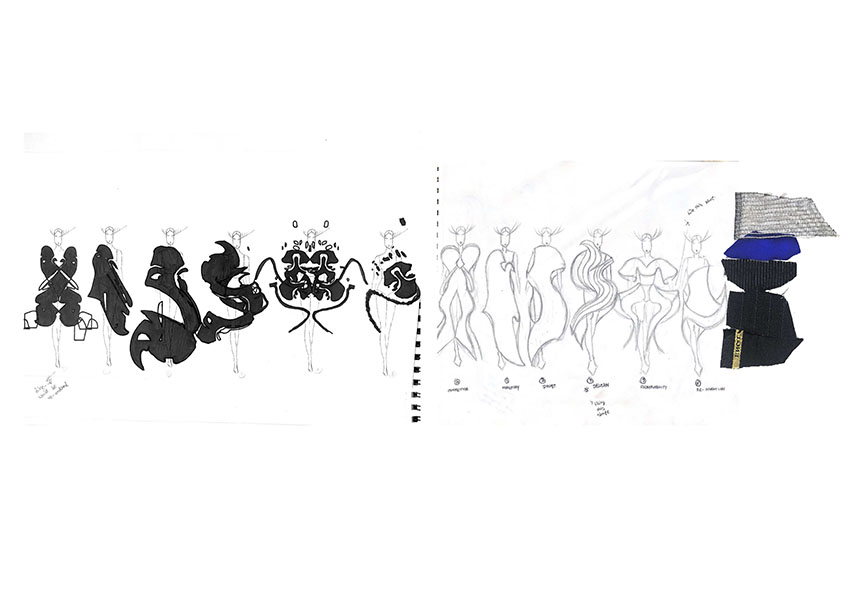 STANDWORK, DRAPERY, AND INVESTIGATIVE PATTERN CUTTING WERE THE MAIN DEVELOPMENTAL PROCESSES USED TO CREATE THIS COLLECTION USING WOOL SUITING, SILK, AND STRIPE ORGANZA.