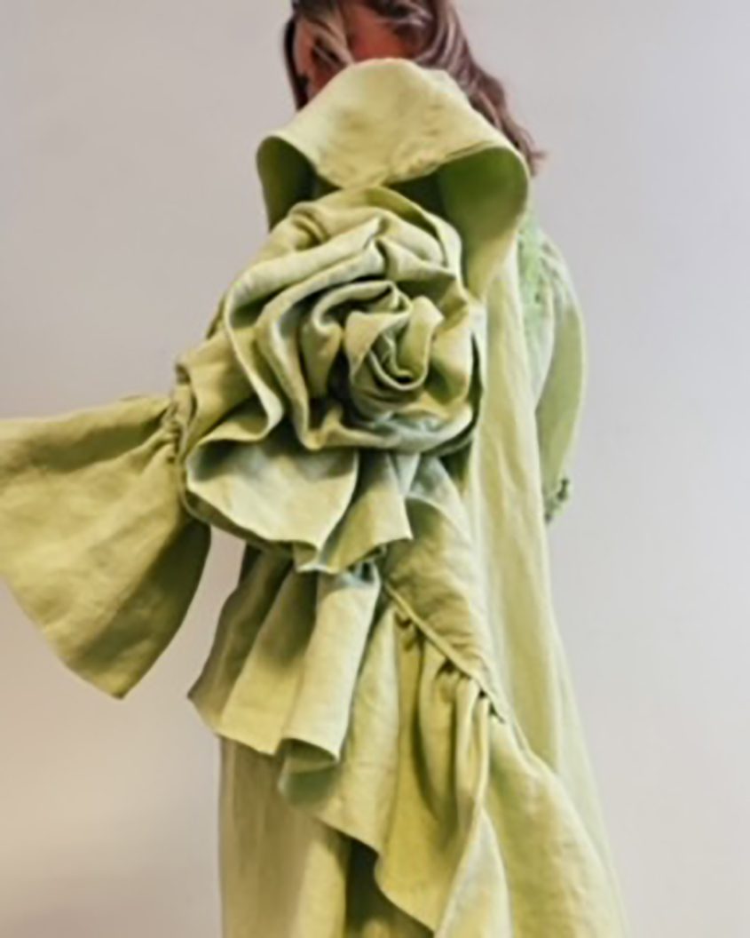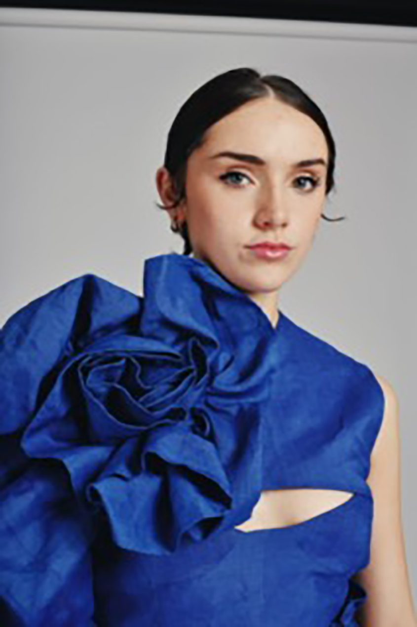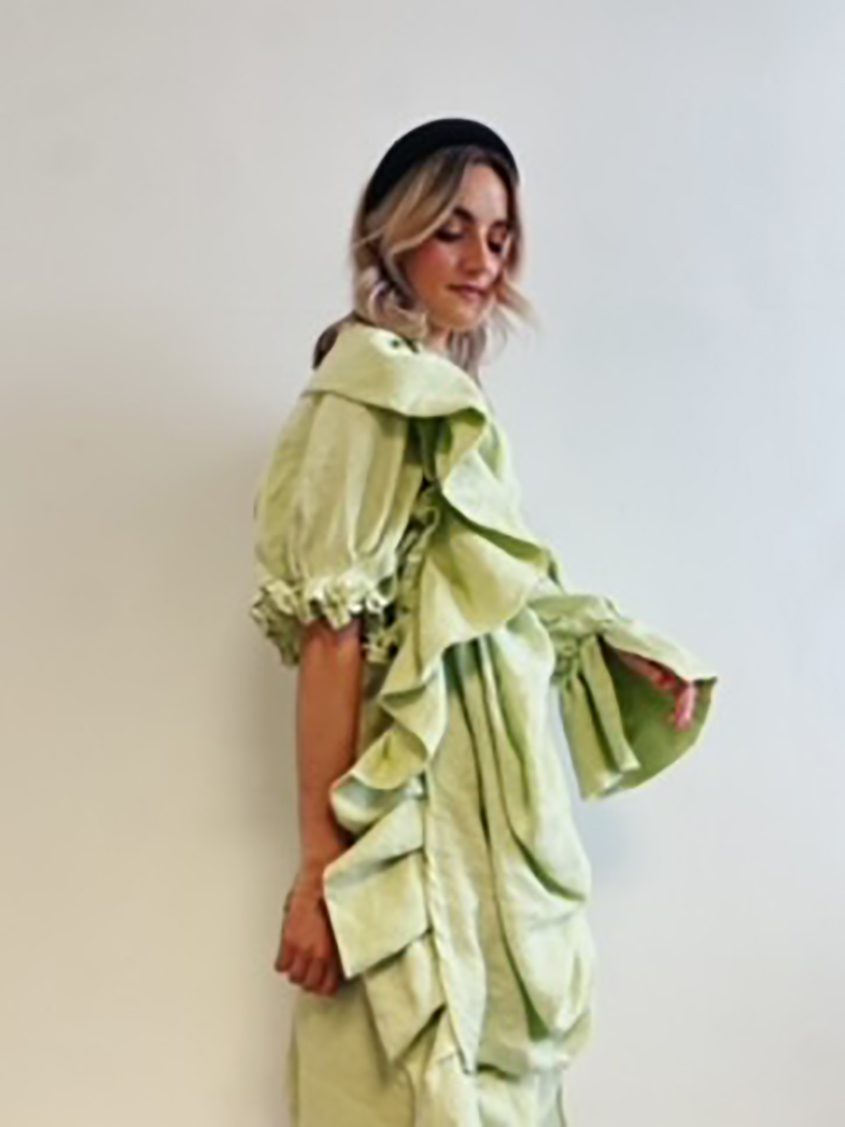 A thalassophile is someone who is completely drawn to the sea in all forms. Éadaoin’s project looks back to her childhood growing up in County Clare and spending lots of time seaside, constantly being drawn to the ocean and having a fond love for the Irish coastline. Her romantic and feminine silhouettes are heavily inspired by the organic coastline and all it’s components; seaweed, shells, waves, sand, marram grass. Her colour pallet also draws inspiration from the tones of the coast. Using the seascape as her source of inspiration, sustainability was an important factor for Éadaoin’s material choice. She used 100% Linen from John England, Armagh.