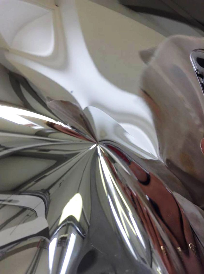 The focus of Edel Canavan’s work is to look at the distortion that can be created within a space using materials and reflective surfaces. The artist explores the interaction between the audience and the work, considering how the materials draw in the viewer. She has constructed large scale, sculptural pieces in order to break up the figure and move away from looking at the traditional view of the figure. Her work revolves around the idea of looking at the body while trying to incorporate and engagement with the viewer. The subject matter is motivated by the idea of distorting the body and the identity around individuals and their sense of self. She creates abstract paintings that are a result of distortion. The work has a sharp and cold quality regarding the materials being used. The is contrasted with the idea of inviting the viewer in to interact with the work.