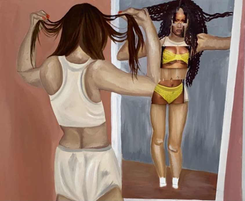 ‘Hall of Faye’ a project based around female body image, exploring the influence of social media in particular Instagram on young females today. Celebrities and social media influencers appear to have quite a profound influence on young people when it comes to appearance. The use of photoshop apps and filters is continuing to create a false reality for young people viewing Instagram content as they see these perfect hour glass shapes and air brushed skin. This may affect the viewers self-esteem as we really don’t know what has gone on behind the scenes before a photo reaches our news feeds. For my project, I photographed the female body looking into mirrors appearing not too satisfied with the reflection looking back at her. Adding in the celebrity or Influencers body and appearance she may prefer to see in the mirror instead as a result of scrolling down her news feed. I created a series of paintings relating to this idea, incorporating collage and mirrors.