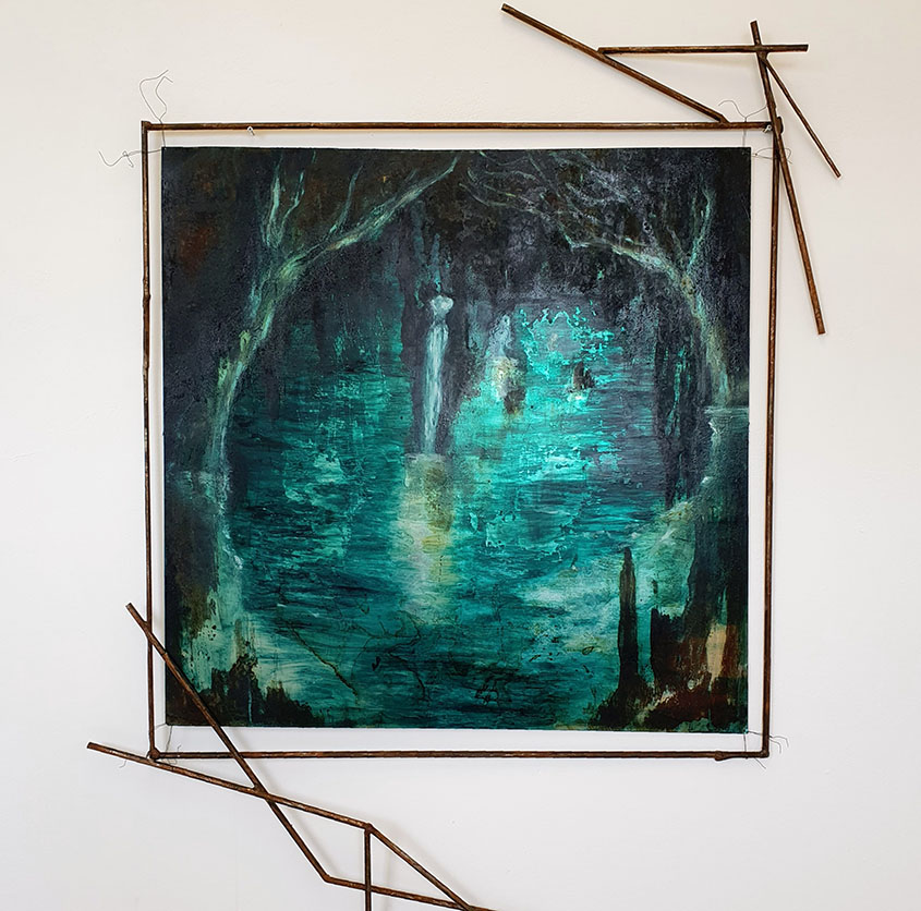 In her degree show work, The River will Reverse Its Flow, Eilis uses paint and scrap metal to create uncanny and dreamlike works of rust, salt, and acidic colour.  These speculative landscapes take inspiration from mythology, science fiction and personal experience, to find the weird in the landscape,  spinning a neo-folklore tale of elemental transformation.