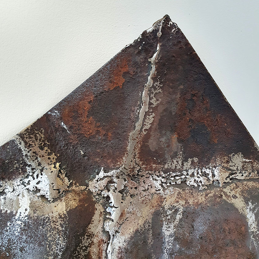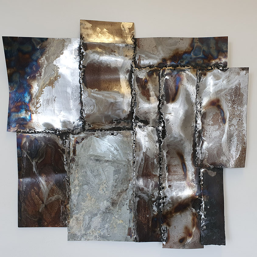 Drawing from her  background of studying outdoor education, Eilis is keenly interested in the raw physical experience of the landscape, which she expresses through her battered and jagged metal-works, which threaten to burst from the wall like a sudden wave, yet suggest with their patinas of rust and scorching, the complex and entangled relationship between humans and their environments. The River Will Reverse Its Flow  depicts a strange and flooded world, which questions what it means to inhabit a world we affect but cannot control.