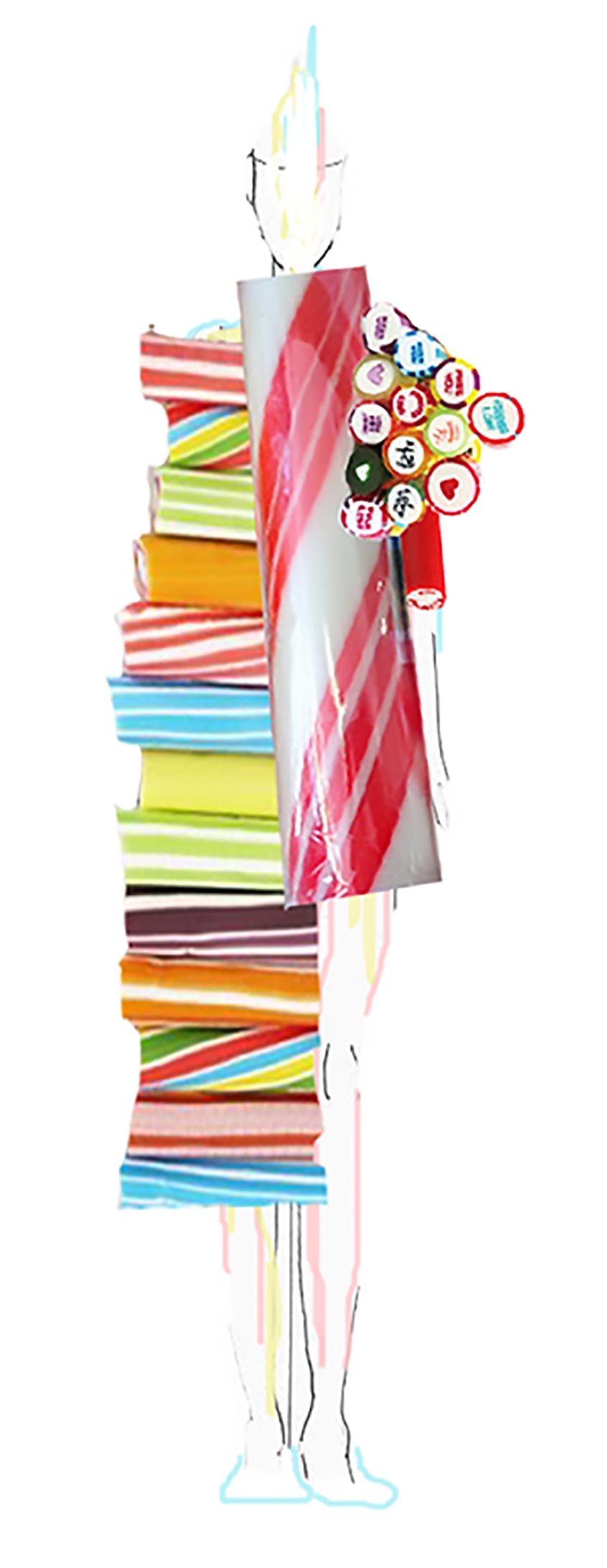 My collection is inspired by the feeling of euphoria when indulging in life’s little pleasures, such as sugar candy. To emulate this feeling of euphoria, I have focused on colour, line and flow within my collection. I have achieved this by investigating innovative cut in both men and women’s wear, while integrating a playful mix of colour and materials.