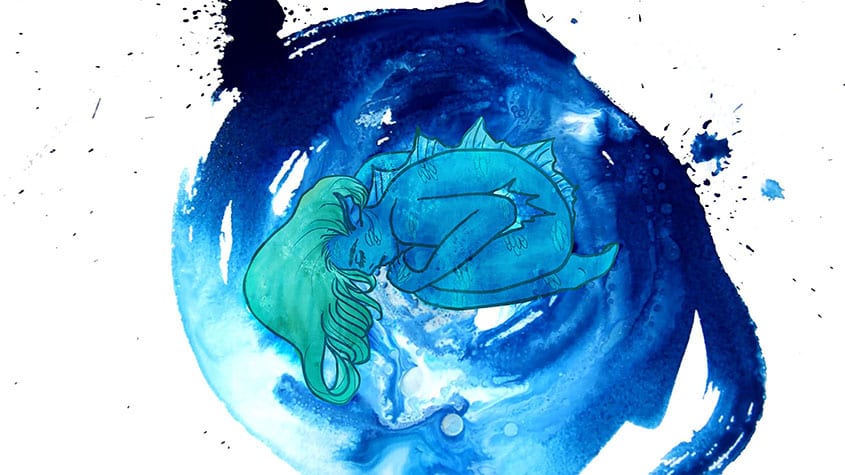 However, as she overcomes these feelings, the therapeutic effect of the ocean is revealed as a calming resolution is achieved. This is mirrored by her metamorphosis. The external reflects the internal. It shows personal development in resolving mental health issues.