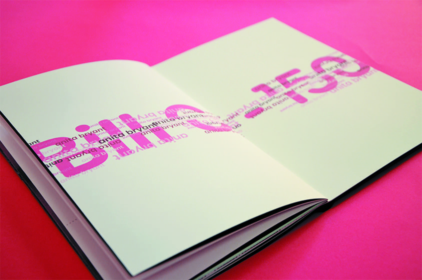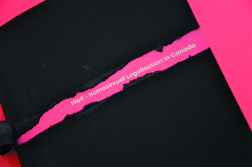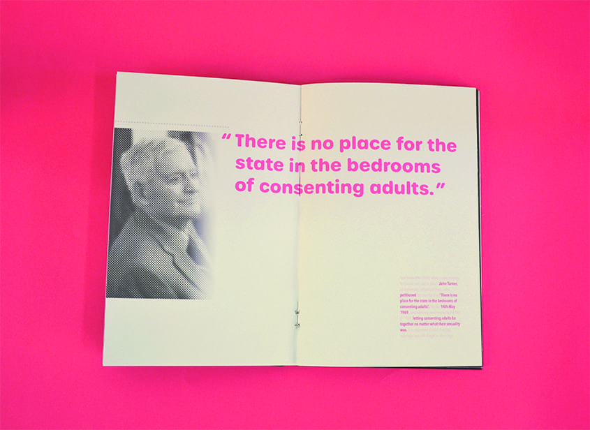 1969 consisted of many milestones for us as a globe. Apollo 10, Boeing 747, ARPANET, Project Blue Book, to name a few . One of these milestones which still continues to change the world today was the legalisation of homosexual relationships, prior to its legality many people were killed or jailed for just being themselves. Taking this into consideration, a means of educating the nation on the life of a homosexual person, prior, during and after 1969 was necessary. The book depicts 3 voices; neon pages telling the story of a lady who was gay during the time of change, the bold body text giving an over view of what was happening at the time, and the entirety of the body text giving a detailed and concise account of what it was/is like to be gay. The piece is designed using two colours, pink and black, lest we not forget the pink and black triangles stitched onto the clothing of gay concentration camp workers. Without the legalising homosexual relationships, gay marriage or gay people becoming a family would be unheard of today…