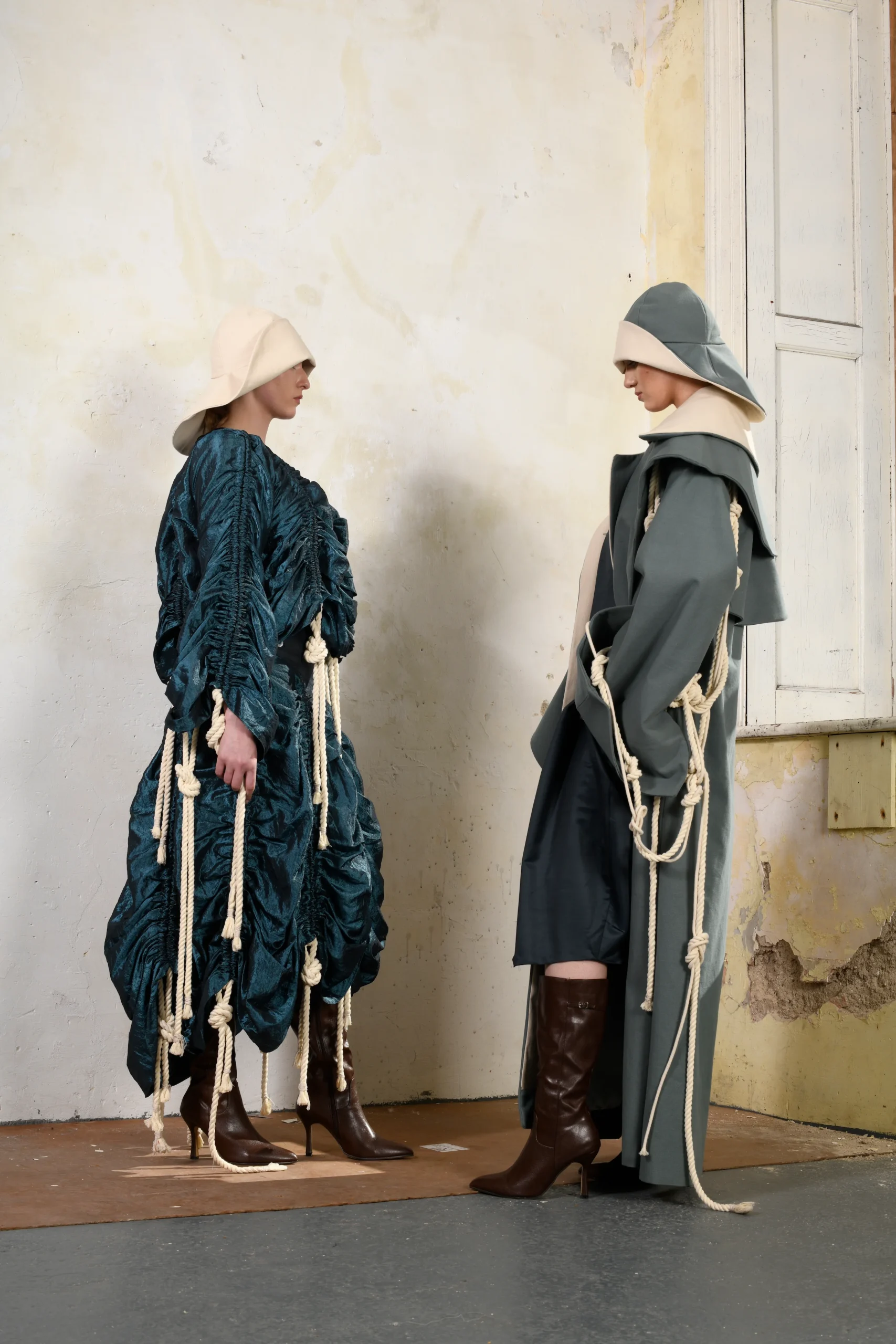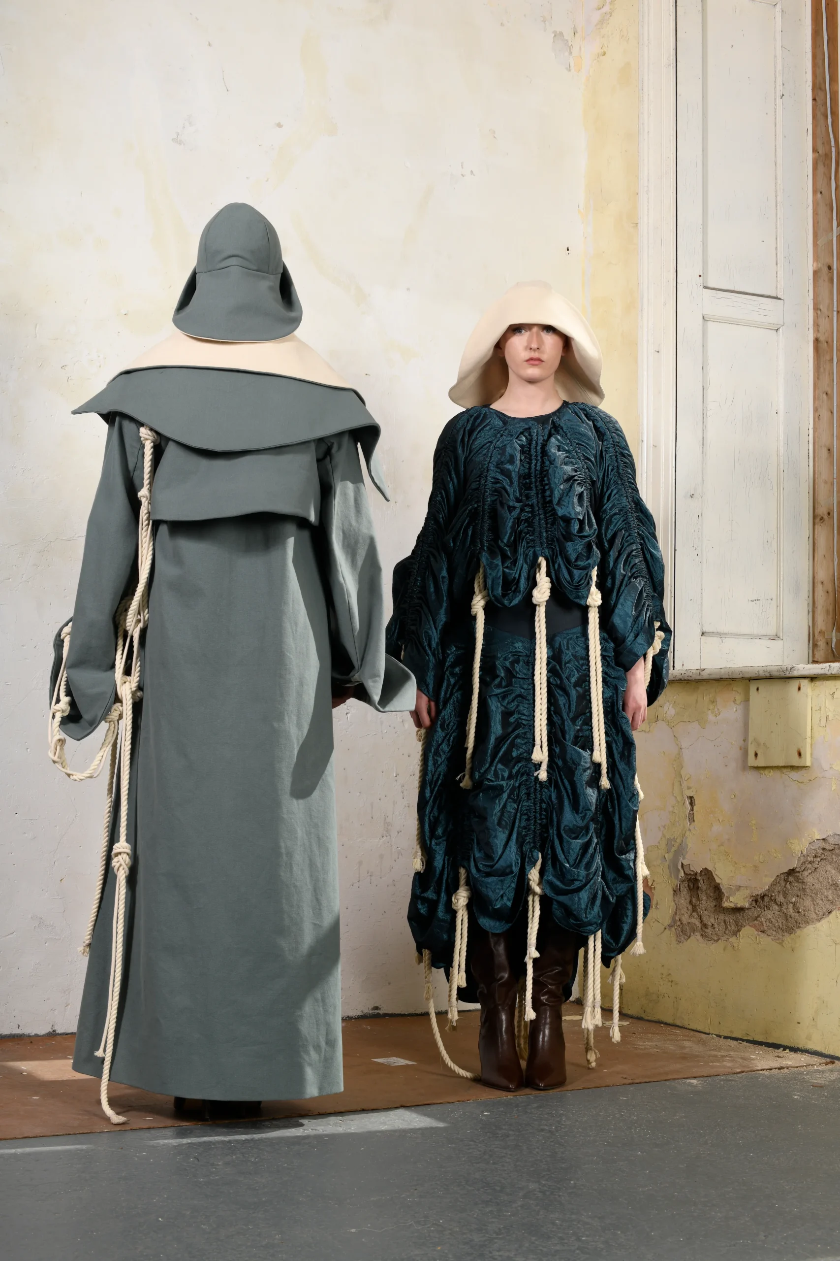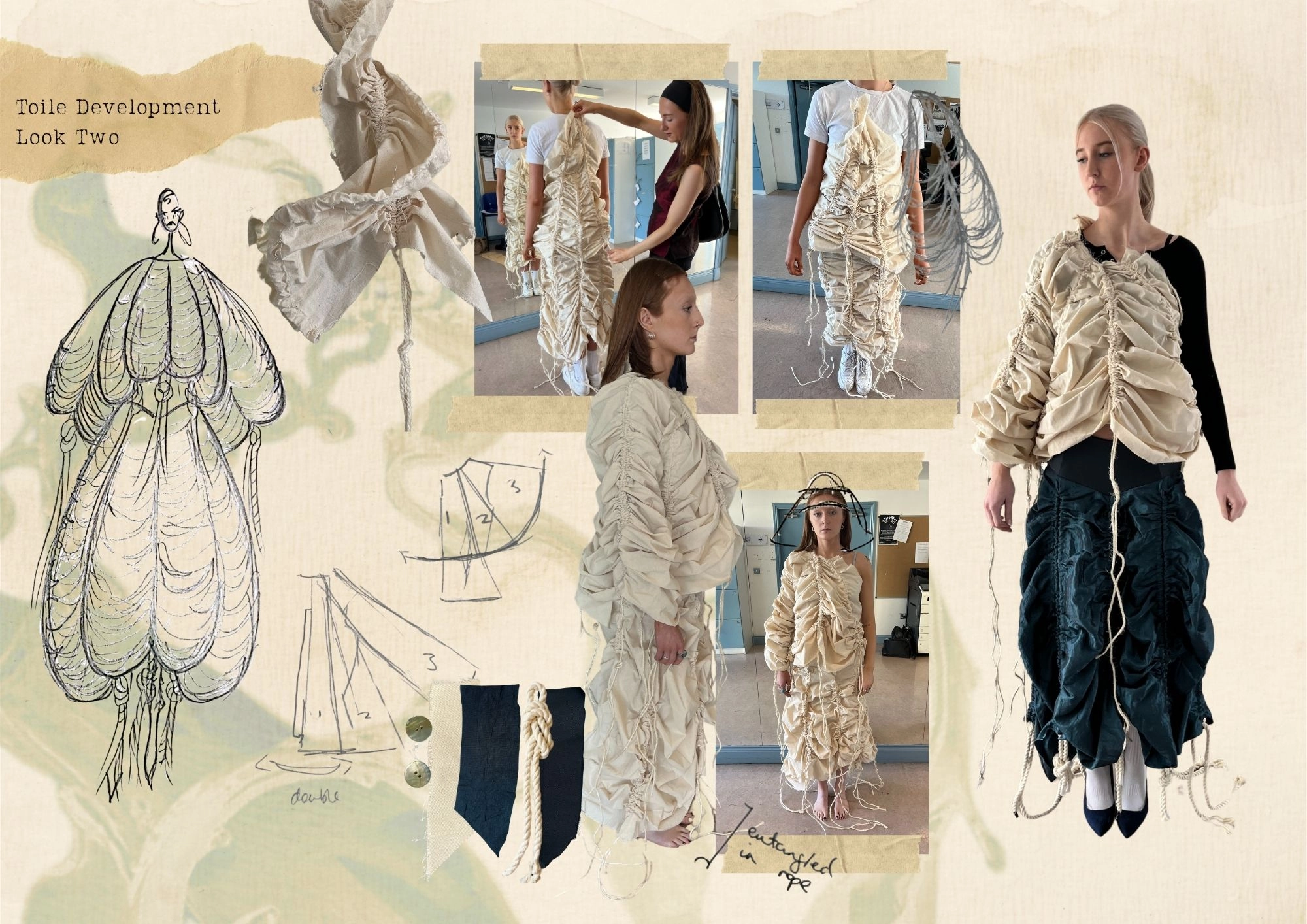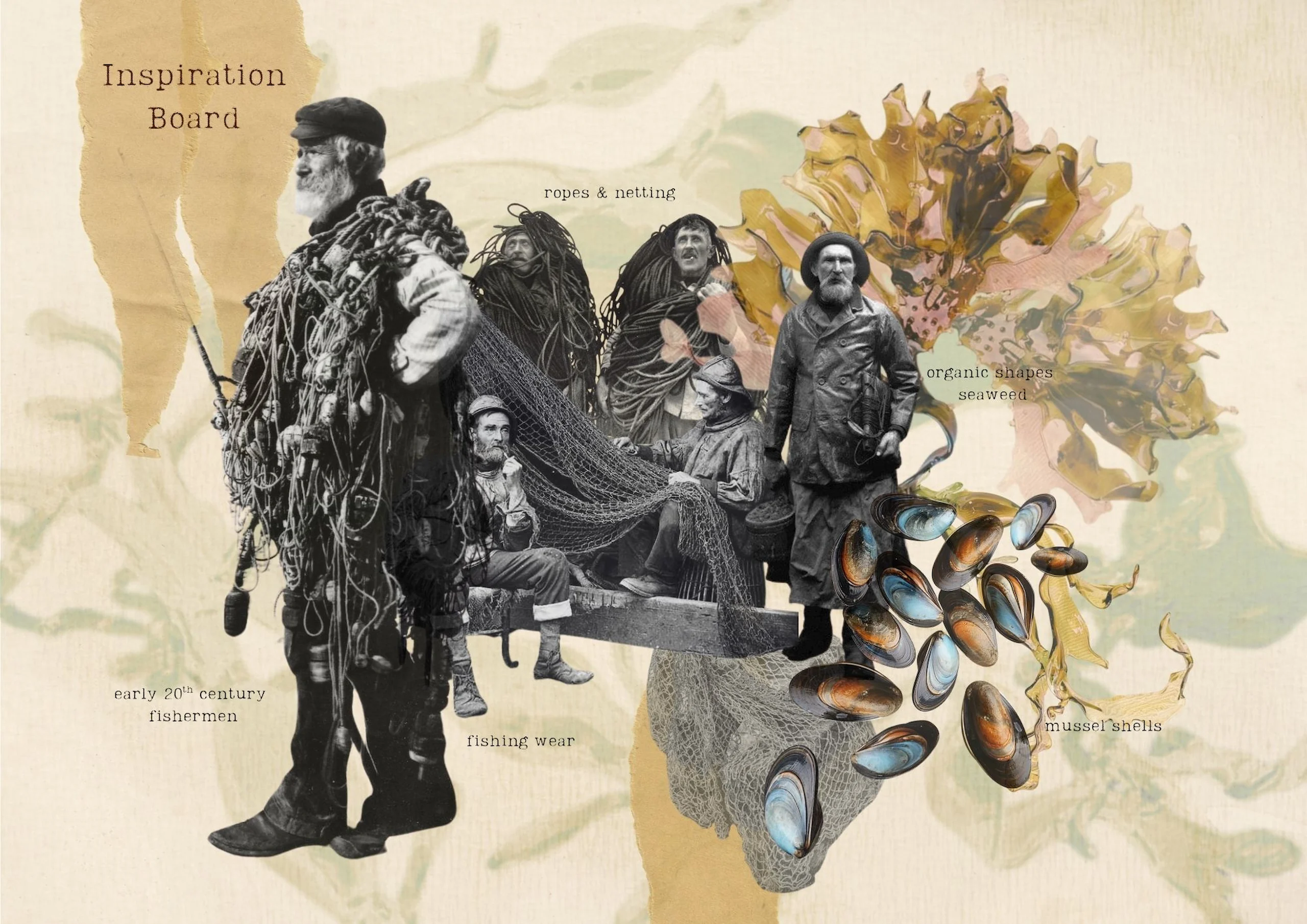 For my design process, I combined the functional aspects of fishermen’s clothing with organic forms of sea life. I researched traditional clothing worn by fishermen, looking at old photographs from early 20th-century Ireland from the Aran Islands and other rural coastal communities. The trench coat is an important piece of outerwear for fishermen and was also an important element of my design process. I sourced a second-hand trench coat and used it to create unique and interesting shapes on the stand and then collaged with these shapes in my sketchbook. I also experimented with rope, a fundamental tool for fishing, layering it over garments and using fishermen’s knots to create texture and enhance the narrative of my collection. The rope serves as a dual symbol: practical, representing the tools of the fishermen’s trade, and metaphysical, symbolizing the sea’s consuming grip. The colour palette for this collection is inspired by the green and blue hues of iridescent mackerel skin.