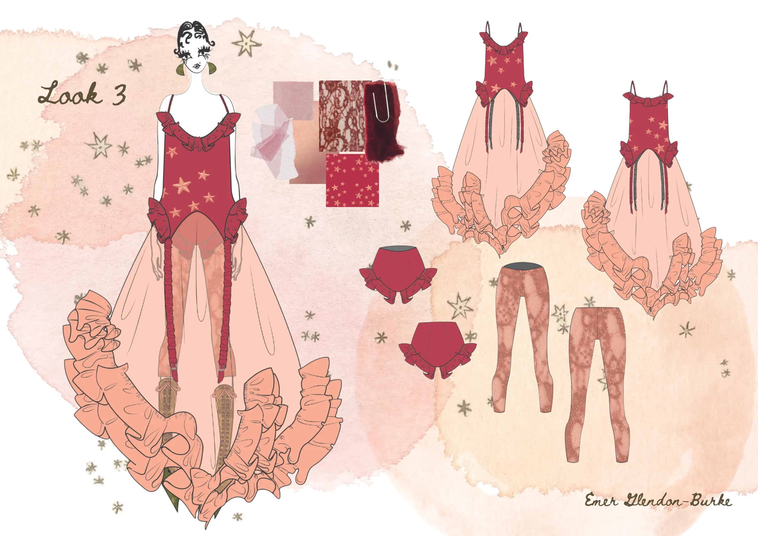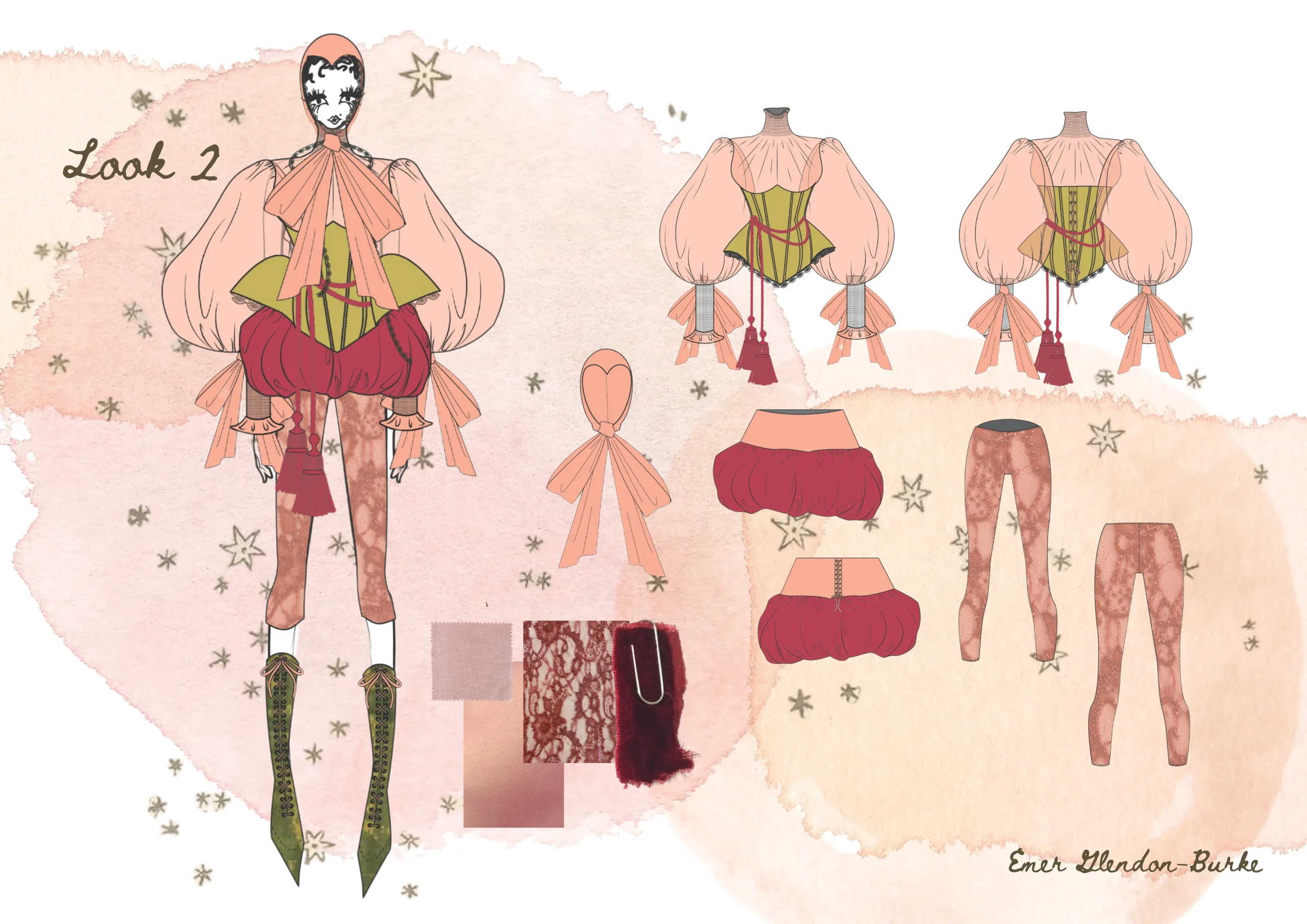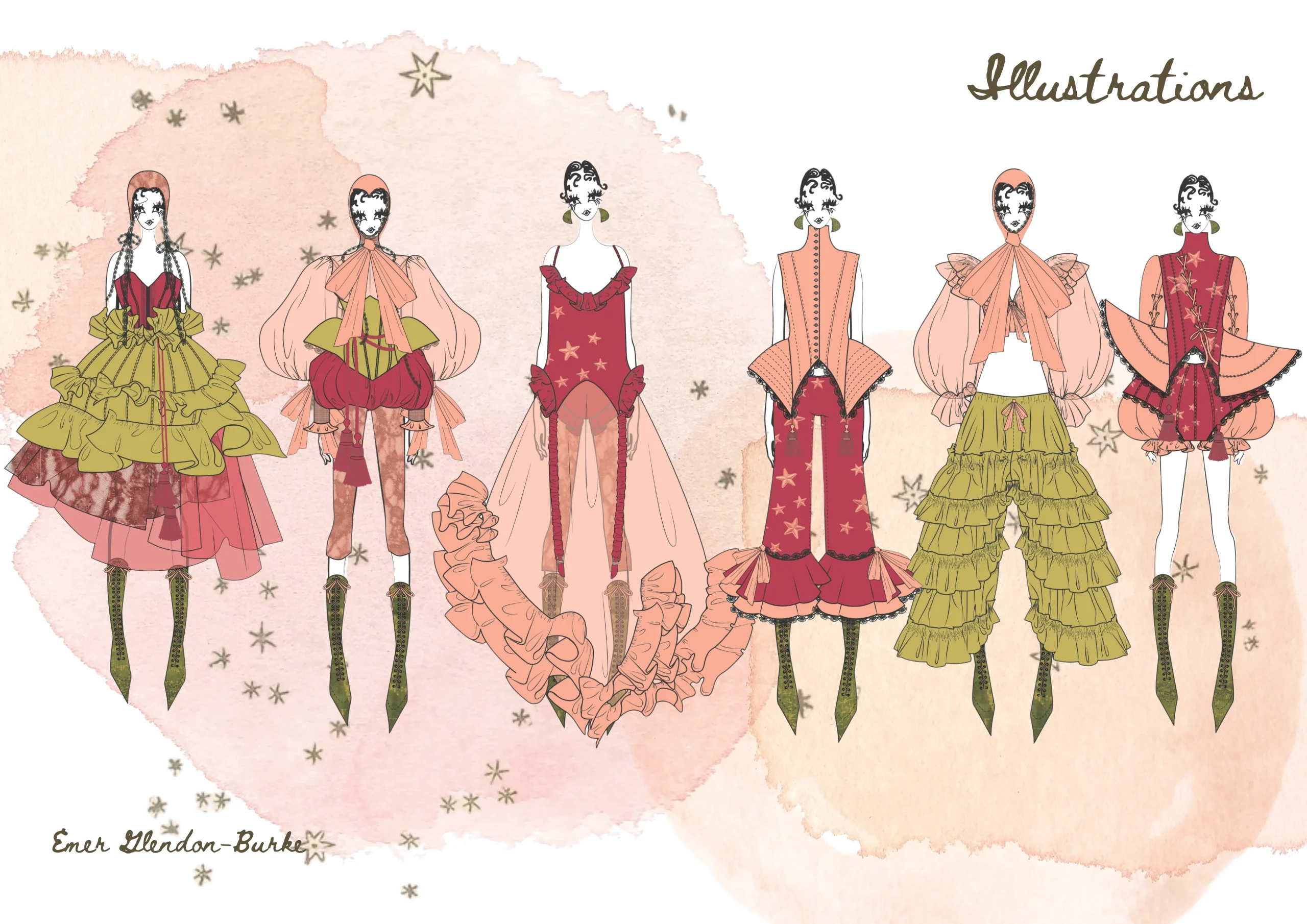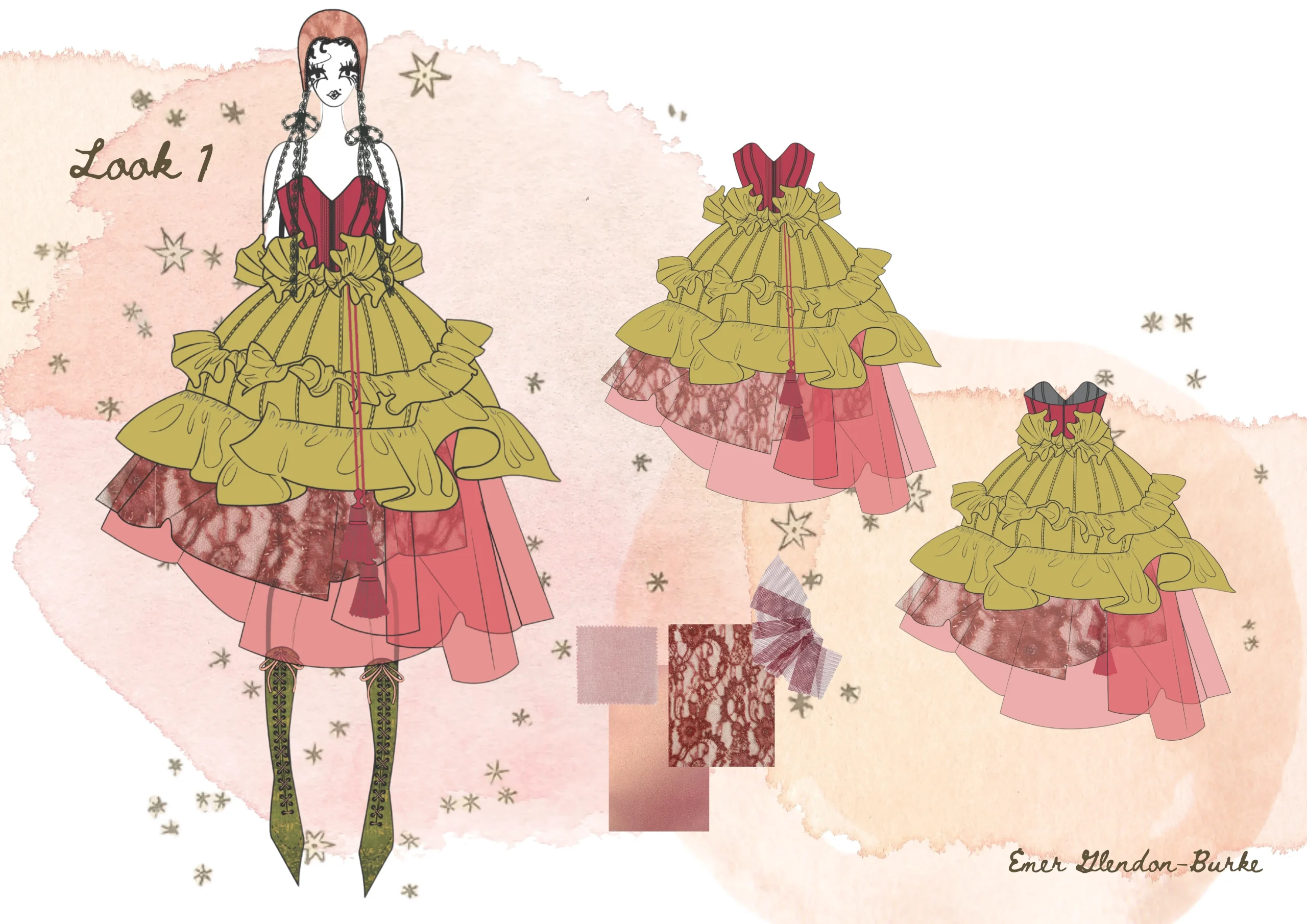 Using Adobe Illustrator, I developed detailed flat drawings and fashion illustrations that reflect the eccentric elegance and dramatic flair of the theme.