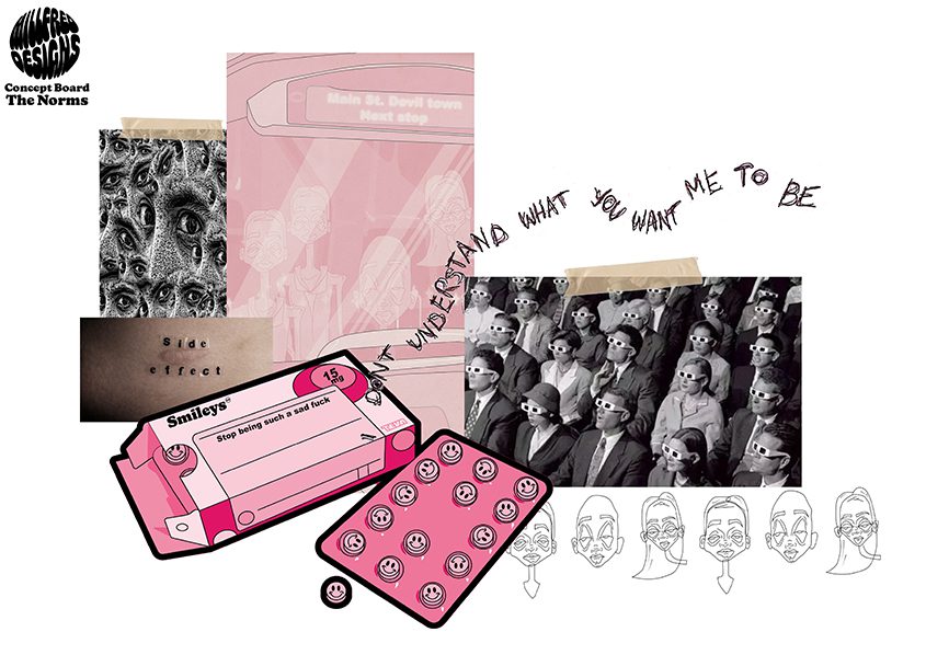 Masking is a complex way for neurodivergent people to navigate a neurotypical world. It can include learning neurotypical attributes, copying behaviours in social settings, and hiding behaviours that other people may perceive as different or unacceptable. This constant conscious effort can be incredibly demanding, and make an individual feel as though their every move is being scrutinized; which is why throughout both my initial conceptual illustrations alongside my textile development I strived to create an atmosphere of being observed by the characters of my imagination.