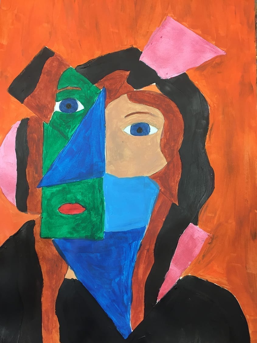 Work from 1st and 5th year students is shown here. 1st years created cubist self-portraits and transformed their paintings into cardboard sculptures before making clay pieces in response. 5th year students explored the idea of how social media effects the lives of young people today. They each responded personally to the brief and participated in critical reviews in class to evolve their work. Their work was the focus for my research project; “How can the pedagogical approach to classroom critique impact students’ critical thinking and concept development in the art room?” My findings indicated that the teacher’s role in orchestrating the critical reviews was vital for enabling students to self-assess their work and execute their work to a higher standard.