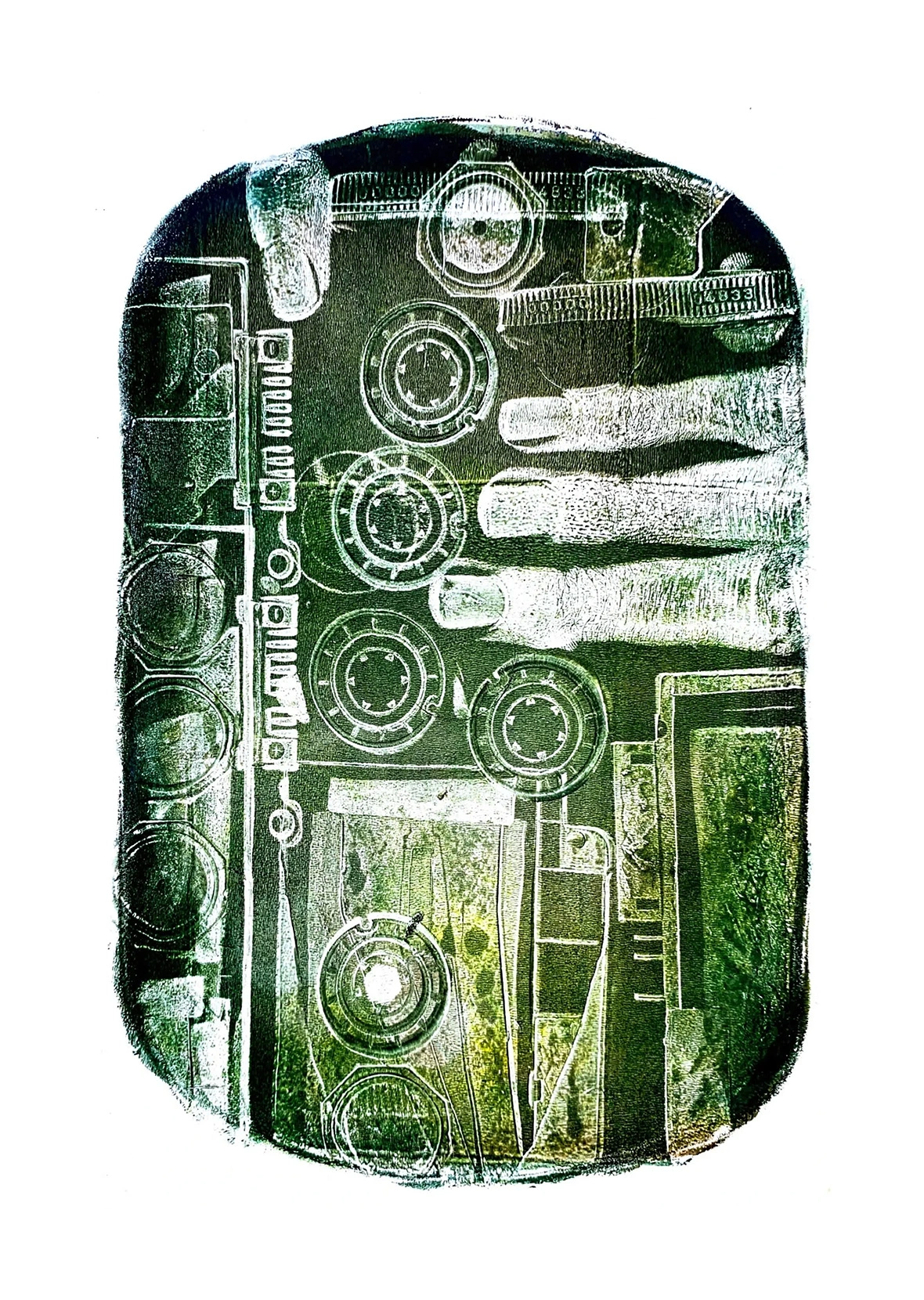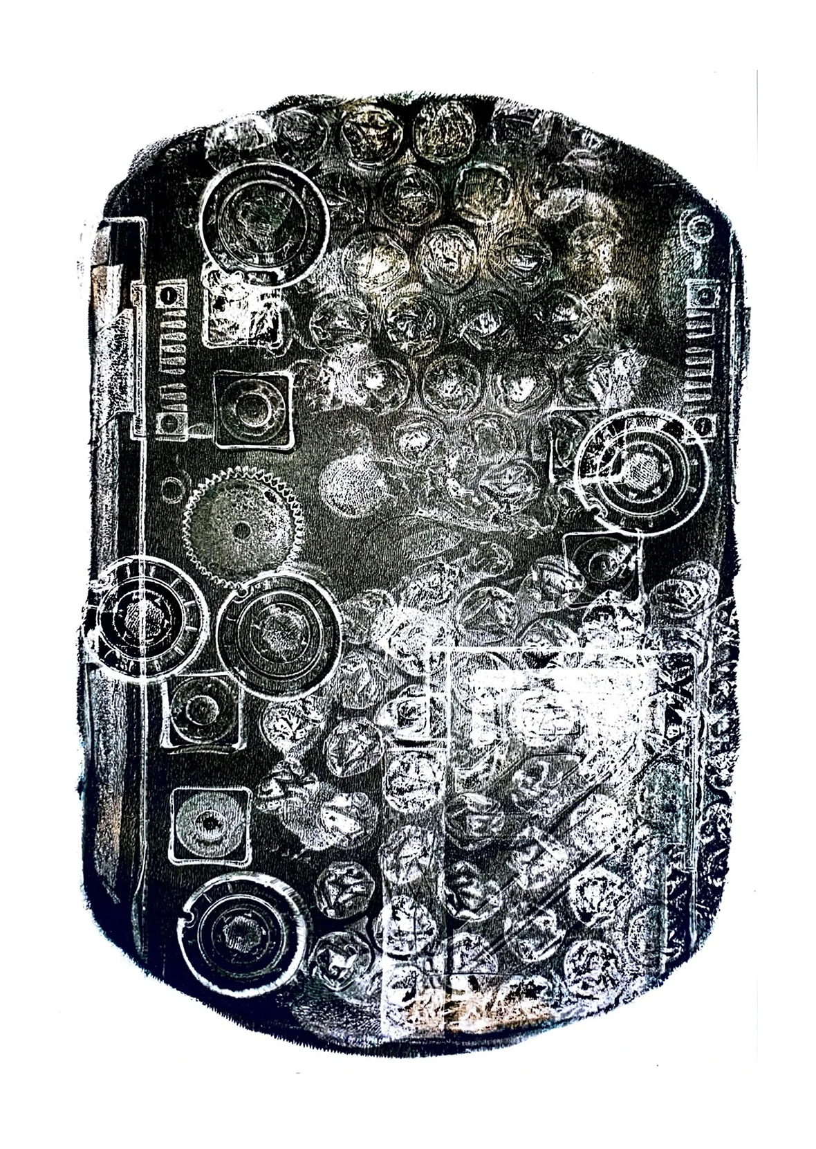 Found objects and elements of redundant technology are embedded into the process, not only as visual references but also as material components. This conscious reuse challenges the disposable nature of modern tech culture and reflects on themes of obsolescence, memory, and materiality. The resulting prints serve as a meditation on the intersection between human touch and machine logic.