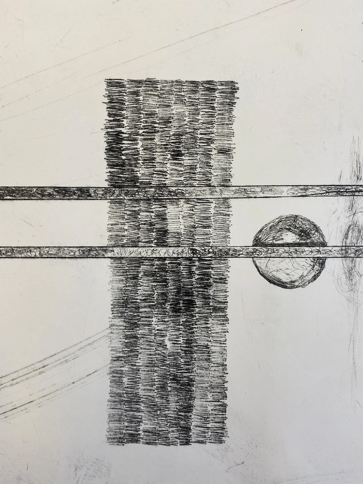 Inspired by nearby data sites, I explore shapes and textures through analogue photography, printmaking, and 3D printing. Drawing influence from Joan Miró and Max Ernst’s surrealist abstractions, I contrast dreamlike, fluid lines with structured, repetitive forms. This disjointed visual language creates tension, reflecting the uneasy coexistence of the physical and digital worlds. by creating contradictions within my processes, I aim to subvert the notion of technological superiority, highlighting the inherent value in both modern and historical modes of production.