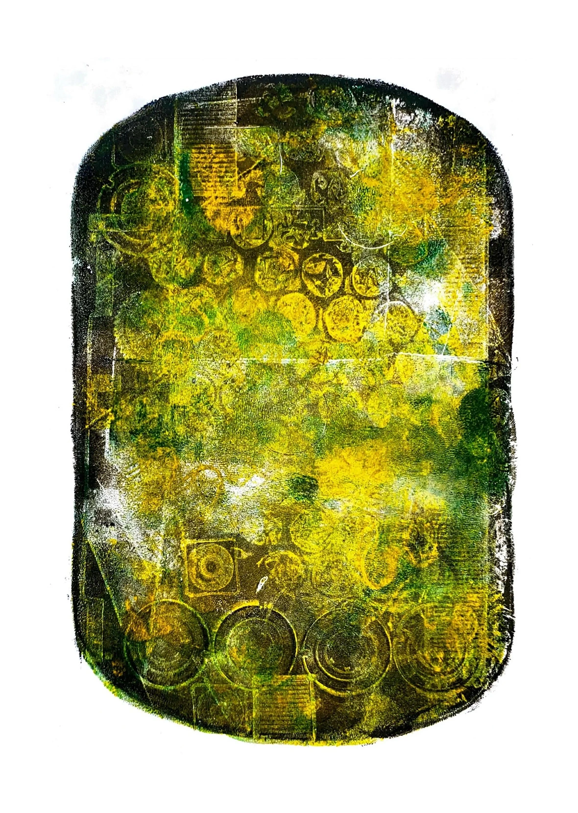 Using handmade Gelli plates as a printmaking tool, the project embraces a tactile and experimental process. Each print becomes a physical response to digital form, translating the cold precision of technological components into layered, organic compositions. The repetition and winding structures echoed in the prints mimic both the functionality of circuitry and the infinite loops of digital information flow.