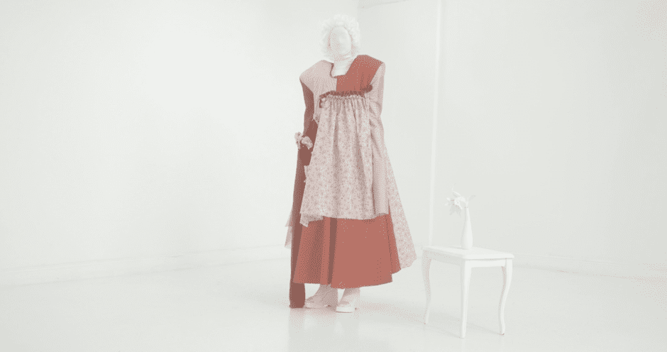 I used a wide variety of fabrics and prints within my collection. Mixing contemporary Gingham and striped prints with traditional florals. My first three looks are a mixture of intense reds and soft pinks with red stripes and gingham prints. Red knitted fabric was chosen as its raw edge has a lovely texture to it and contributes to my story. Classical floral prints were meaningful throughout the collection, channelling the innocent girly side of my theme. My second three looks are a mixture of yellows and pinks whilst also incorporating stripes, Gingham and a old style woven floral pattern. Yellow brocade is also included in my final three outfits. Embroidered words on my garments show the intrusive nature of the story.