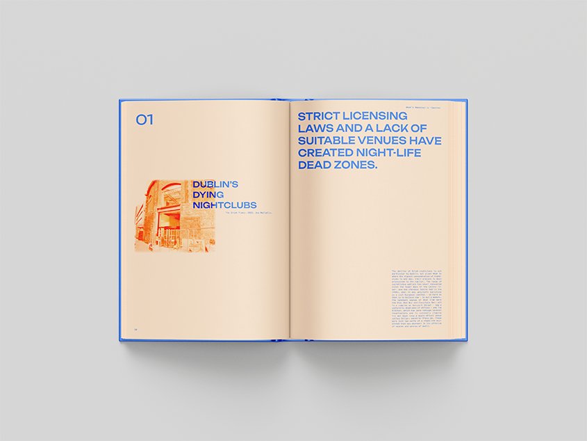This publication is a discussion and exploration about how Ireland has lost the element of dancing to drinking overtime within our nightlife culture. This conversation was ignited by nationwide nightclub closures and new legislation to be imminently passed, allowing nightclubs to operate until 6 am to hopefully improve Irish nightlife. As nightclubs are first and foremost for dancing, this publication further discusses how Ireland needs to bring the focus back to dancing rather than drinking, and how we can save this dying pastime. The article ‘Dublin’s Dying Nightclubs’ is featured which analyses the contributing factors to Ireland’s nightlife dire state. It also includes interviews with my grandparents about their dancing experiences and how Ireland’s nightlife has changed over the years. Lastly, it features a collection of survey responses from young Irish people about what they believe Irish nightlife should be.