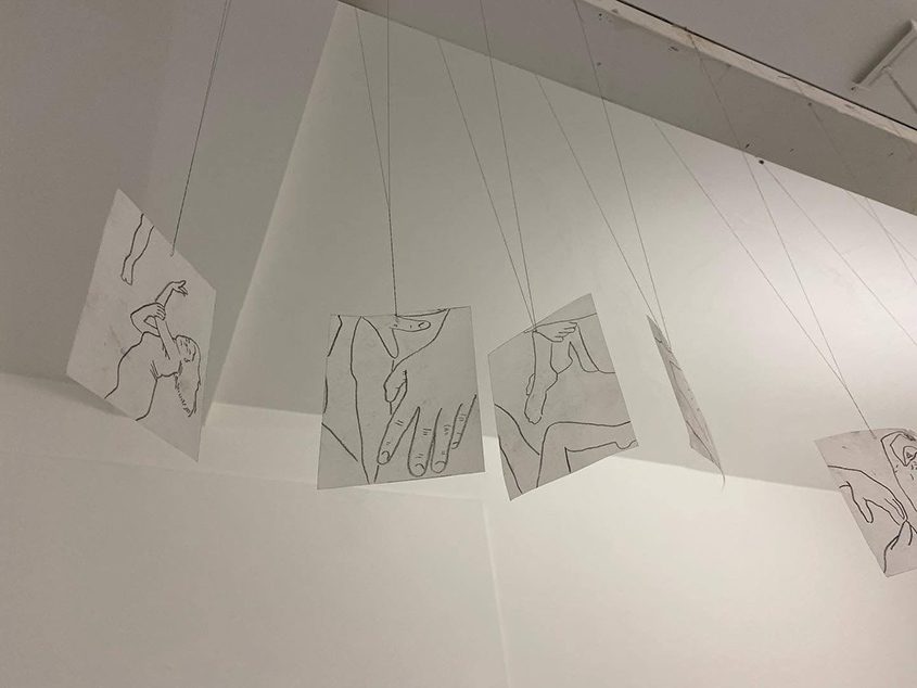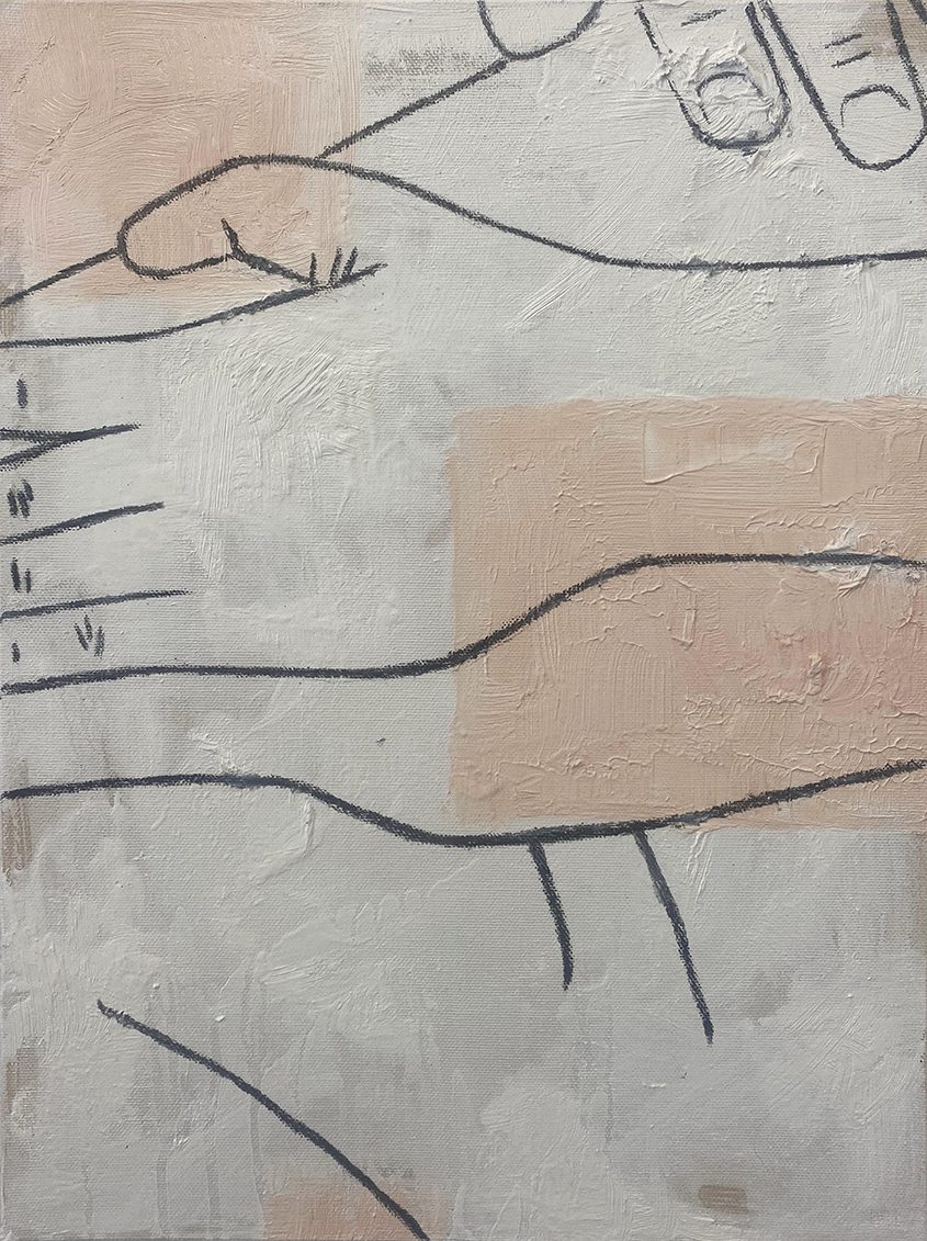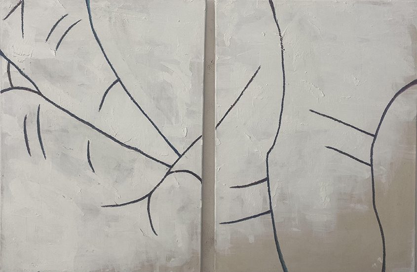 She highlights the physicality and presence of the human body through her thick application of gesso and oil paint which she works back into with pencil, charcoal and oil pastels. Through the mixing of poses from previously choreographed photoshoots, she dances between linear figuration and abstraction in her paintings. By highlighting the dynamic relationship between the body and its surroundings she creates an experience which can be organised, delicate or chaotic – reminiscent of performance and life itself.