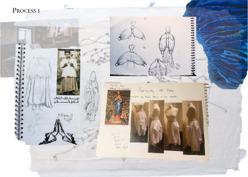 Inspired by a memoir written by my grandfather Daniel Joseph Cahill, this collection reconnects us with the unique childhood he had, growing up on the remote and very rural island of Bere Island in West Cork in the 1920s/30s. As the collection evolves, it weaves through elements of island life, such as owning the only pub and shop on the island, while living alongside a base for the British Military. Silhouette is inspired by physical fragments of daily life from that time, some of these which are still in my family’s possession. The fabrics of deadstock velvet, damask and antique, embroidered cotton lawn and lace represent those that would have been found in any Irish pub and typical household at the time while the silk draws in the beautiful drape of the statue of Our Lady – a centre piece of my grandfather’s Catholic upbringing in Cahill’s pub and shop. My grandad has helped to shape me into who I am today and this collection is a tribute to him.