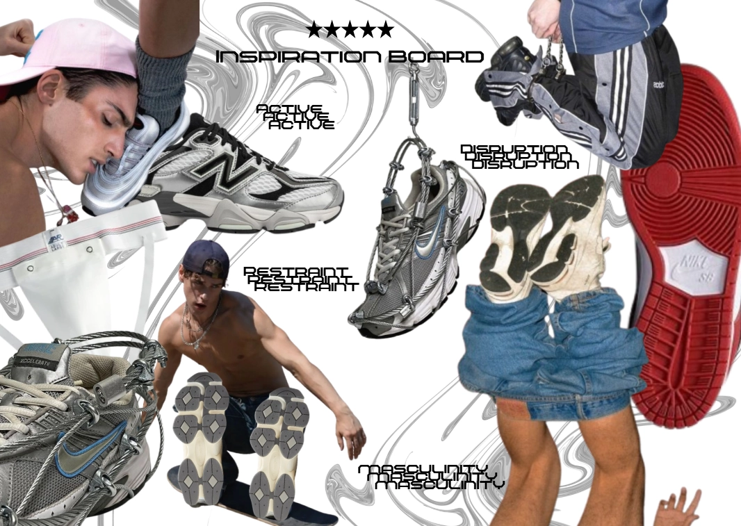 Homoerotic Sole is a menswear A/W streetwear collection exploring the provocative intersection of homoerotica, sneaker culture, and the subversive edge of 90s aesthetics. Rooted in the tension between desire and defiance, the collection draws visual and thematic cues from archival queer imagery and the stylized bravado of sneaker-obsessed youth culture.