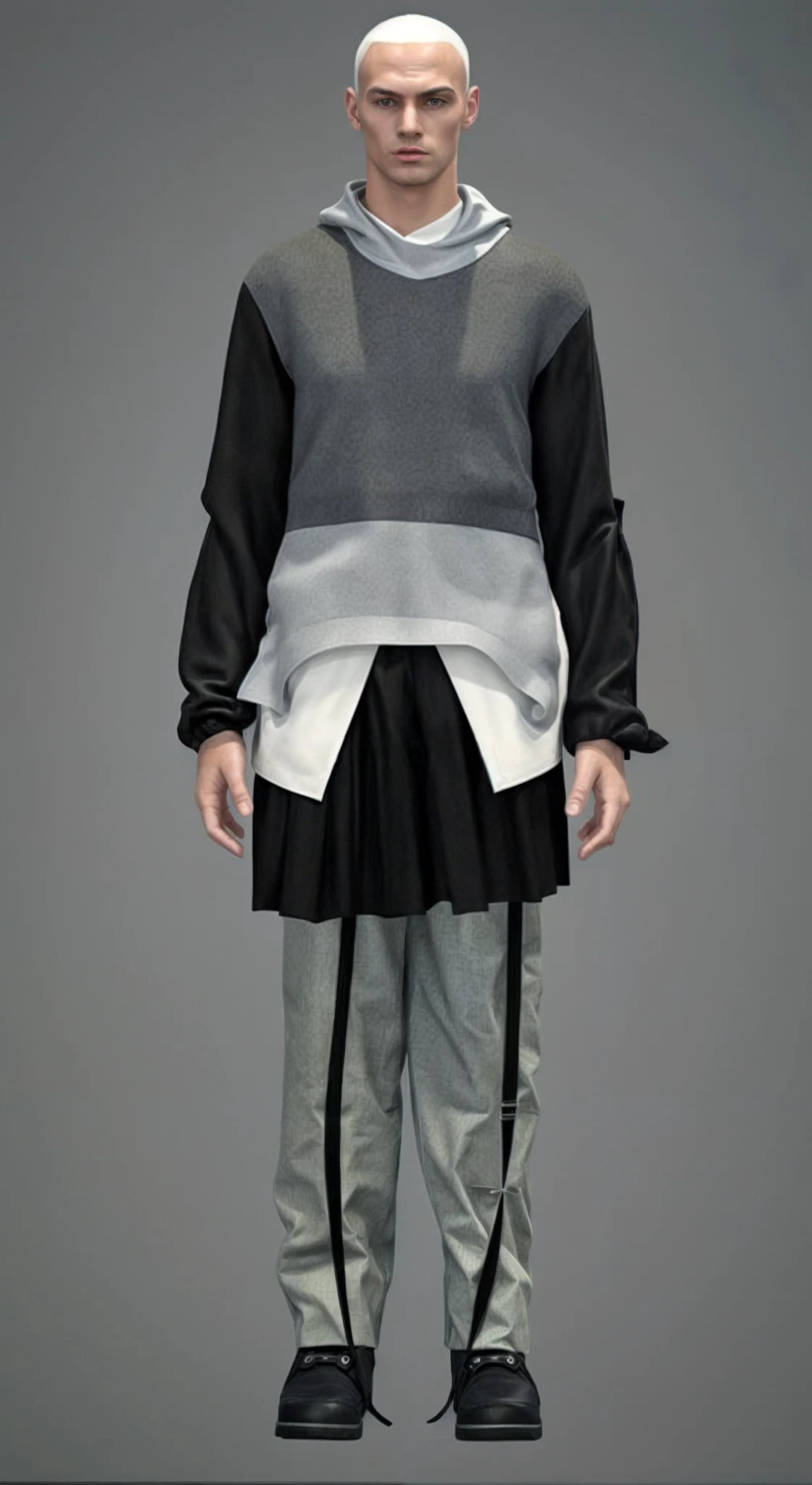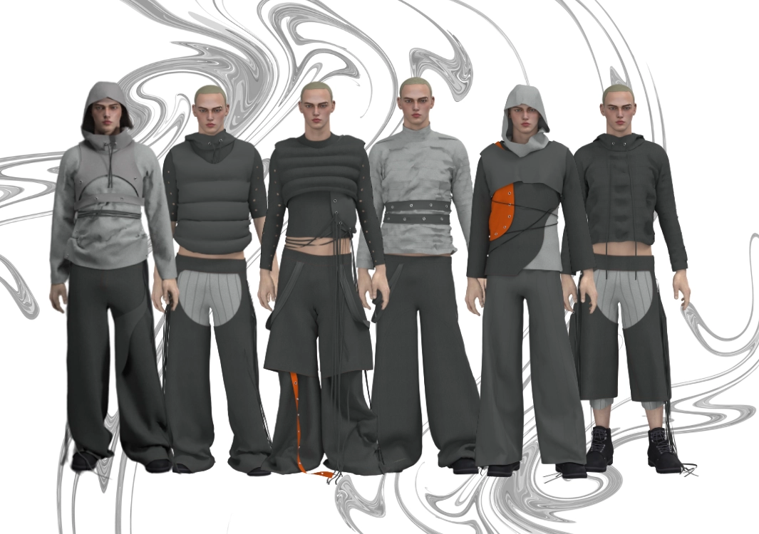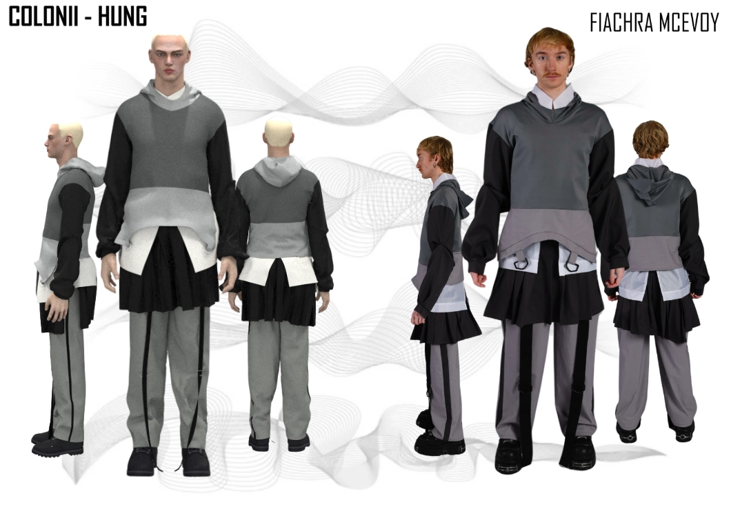 This project was a collaborative effort between myself and Colonii, a company exploring the intersection of creativity and artificial intelligence. The collection is a four-look menswear lineup inspired by one of Colonii’s digital characters, Hung. Drawing from Hung’s narrative and personality, I aimed to develop a collection that blends streetwear influences with classic tailoring, reflecting both contemporary youth culture and timeless sartorial structure.