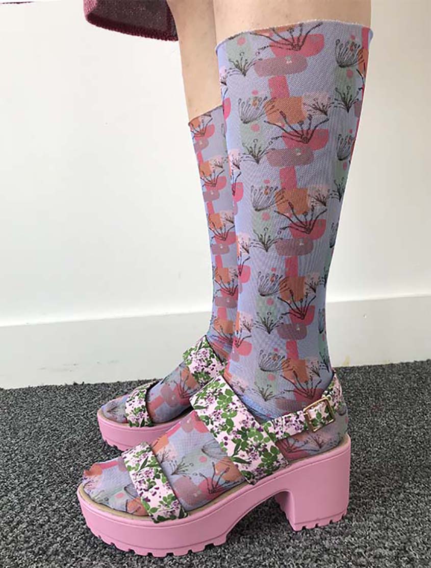 Throughout my collection my garments are based off using the domestic knitting machine, shima seiki, surface design and digital pattern design. As a fashion knitwear designer I was influenced by the work of Richard Quinn with his clever use of clashed prints. Using a variety of techniques within my knitwear collection such as digital prints, jewellery making and fringing captures my botanical and floral overload aesthetic.
