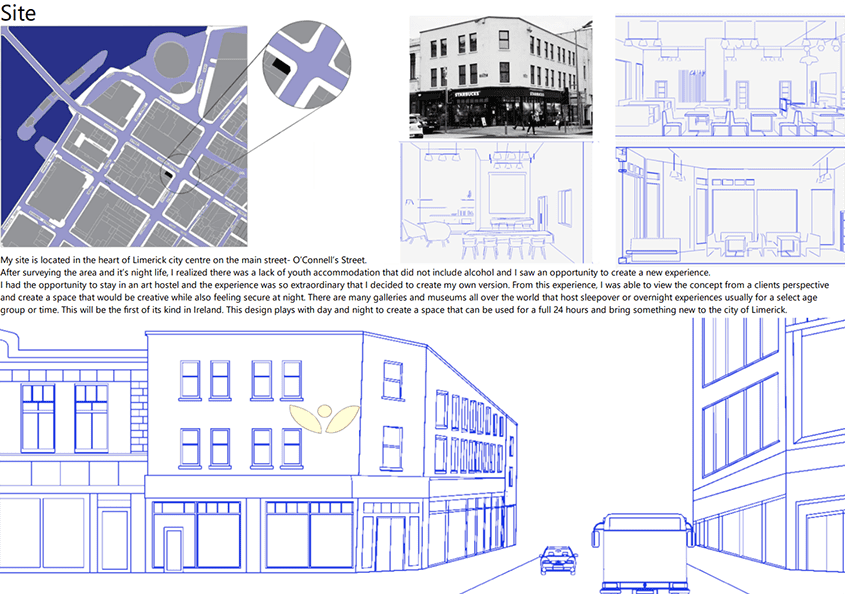 For this design I created an artist’s space that opens at night as a hostel in Limerick City Centre.Working on this project I drew on my own experience sleeping in an art hostel during Dutch Design Week in 2019. The pop-up hostel by artist Florian de Visser comprised of a series of cardboard boxes and projections. Reference the correct name of the project ‘Tourist-Site-Seeing hotel room at Hotel Insomnia / De Fabriek’. This experience formed an idea of dual use, and a question of why such amazing spaces like art galleries did close at night? how much more exhilarating it was to be able to look at art all night or sleep surrounded by art and be able to become part of the art yourself. To create this space in Limerick I researchedart, culture and history that is abundant in Ireland. I continued with the theory that art follows nature and using the Irish peacock butterfly and its life transformation from caterpillar to cocoon or chrysalis to butterfly and my concept emerged. With this in mind, I designed Chrysalis-An art café and learning space on the ground floor where local artists can sell work and share skills and knowledge. Two art galleries on the first and second floor with hidden beds in the roof are assembled for overnight guests. The first and second floor plans replicate each other similar to butterfly’s wings. The circulation throughout the space also follows the butterfly flight pattern. These spaces create a sense of unity and harmony with the art and create a new experience of going to sleep and waking up surrounded by creativity.