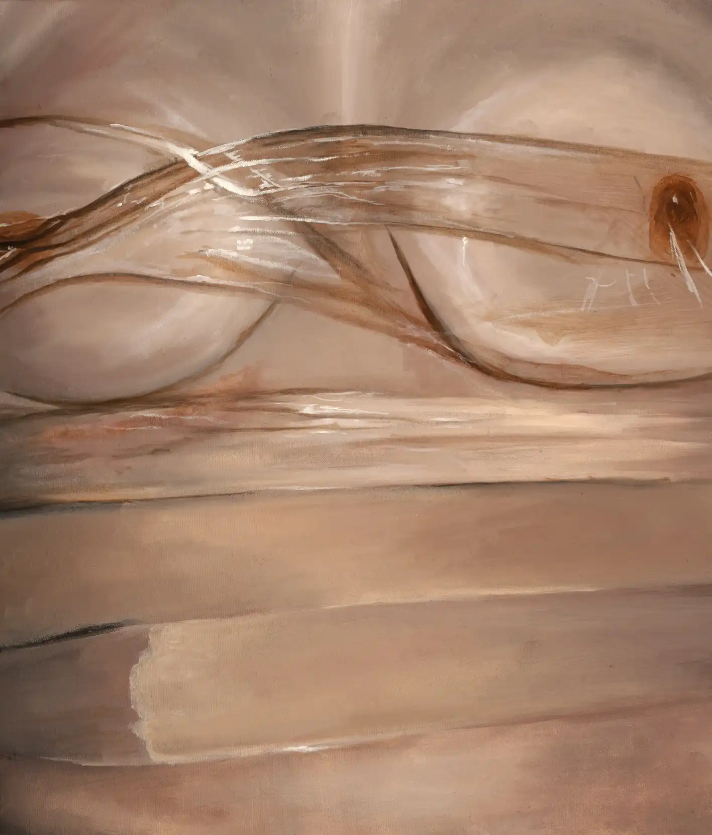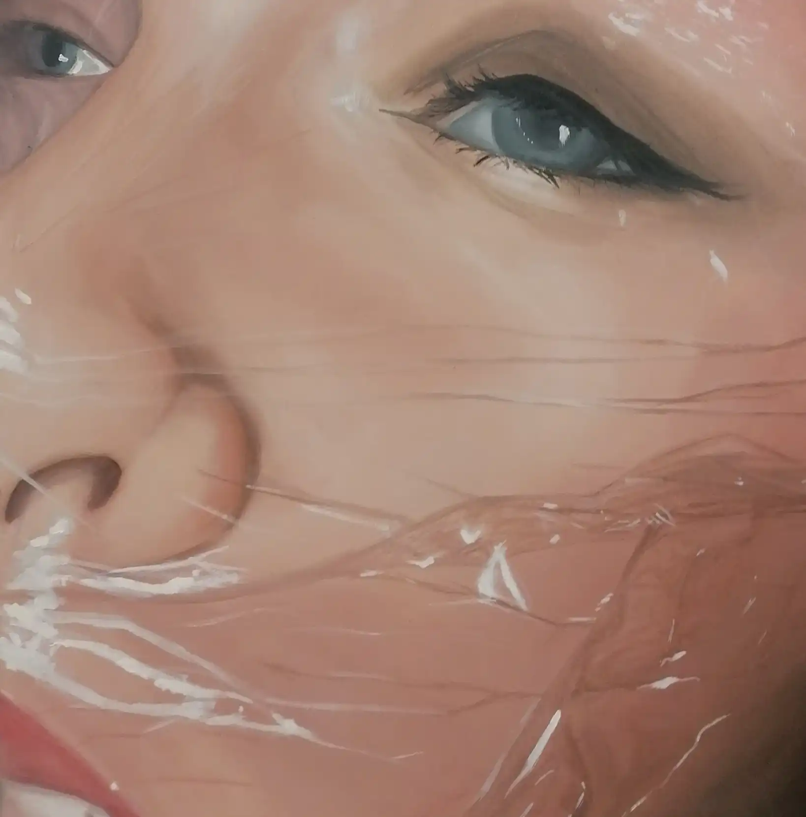 A recurring theme in her work is the painted texture of plastic, wrapping, clinging, or distorting the body. This is a symbol for the synthetic and often invisible ways in which societal ideals embed themselves beneath the skin. Unlike references to plastic surgery or cosmetic enhancement, these depictions speak to a quieter, more subtle internalisation.