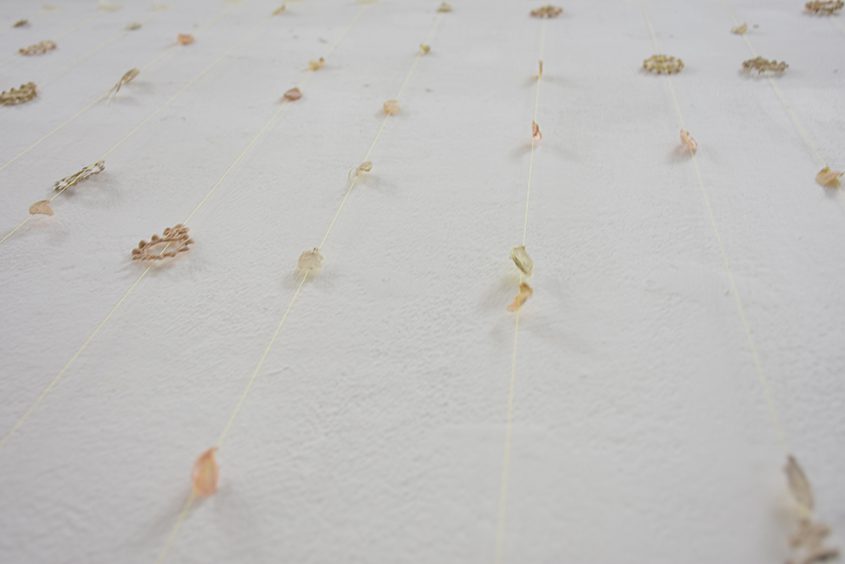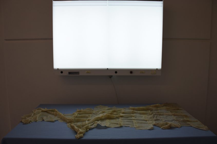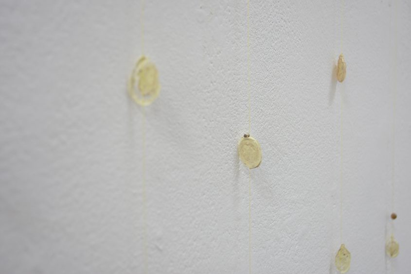 Hutchinson`s aim is to highlight the unseen areas of an invisible illness, such as the meticulous and mundane activities that consumes a sufferer’s life. Activities such as the laborious act of taking medication and praying. These are physical and psychological acts that are both time consuming and repetitive, but they are also silent and unseen. The artist uses primary research, ‘tablet sheets’ belonging to her grandmother as a reference for this body of work. The tablet sheets are a physical artefact that recorded the action of taking medication, as they include specific details such as a day, date, time, and the name of the action performed. Through an investigation of the materials` surface, such as the repetition of lines and marks on these ‘tablet sheets’, the artist was inspired to mimic this physical and forceful repetition in her material presence. The artist is motivated by exploring how religion and illness can intertwine, and how religion can be used as a form of therapy and healing, through the discourse of mortality.