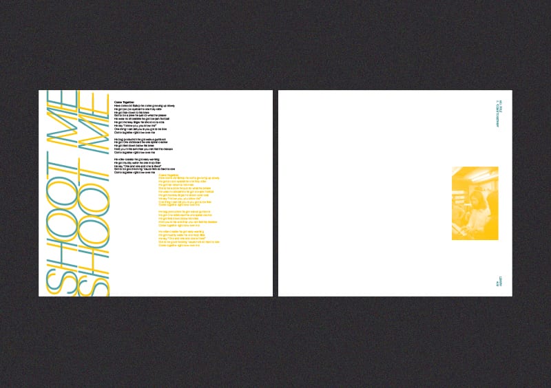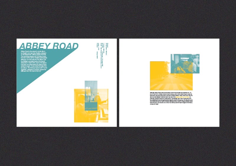 The recording sessions for Abbey Road were the last in which all four Beatles participated. This editorial project aims to capture the divisive state that the Beatles were in during the albums production. Many critics now view the album as the Beatles’ best and rank it as one of the greatest albums of all time. The project showcases how opposing perspectives can end up creating great art. The harsh angles in the piece can be read as a visual allegory for the bands creative conflict. The overlaying colours also showcase the artistic juxtaposition found in the record. The format of the printed piece is informed by the size of vinyl records, and the front cover acts as a record sleeve. The binding has 4 points of connection to represent each band member, it also uses exposed string to reference the instruments of the band. Overall, the project investigates how conflicting creative approaches can still yield successful results.