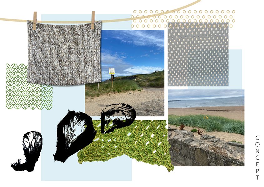 The designer’s primary source of inspiration for this collection is a bench located on Bundoran Beach in Co. Donegal, where they would sit during the summer when they needed a break from the chaos of life and the world around them. Watching the sea from this bench was incredibly calming, but also evoked a sense of fear when the designer thought too much about it. To express these conflicting emotions towards the sea, the designer used textiles inspired by the beach surroundings, layering darker and lighter colours to create the desired effect in their collection.