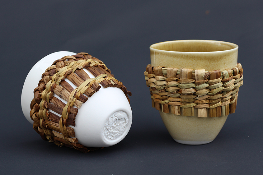 The natural beauty of Lough Derg draws me. There, I harvest my bull rushes (Scirpus Lacustris) chest deep in fresh waters. These then go through a lengthy process before being woven to create insulating sleeves for ceramic pieces or cast to leave a permanent imprint on the ceramics.