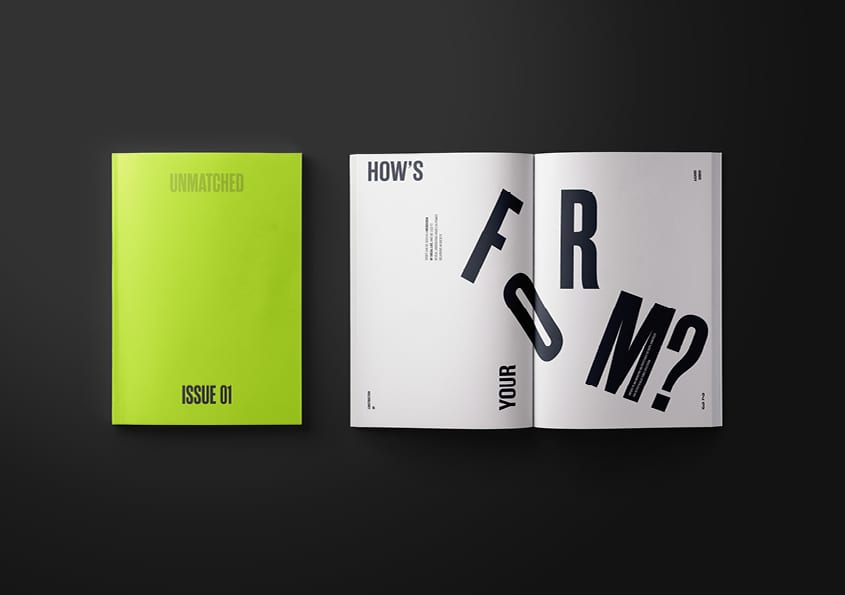 UNMATCHED is a print publication highlighting the issue of gender inequality in professional sport. The typographic expression is bold and unapologetic playing on scale, colour and composition with the overall concept relating to the idea of form, relevant to any sport. The letterforms mimic the unrest and unevenness of the gender bias, taking direct visual inspiration from each sport and its structure. For example, tennis works in the diagonal beginning with an opposite serve as the ball is followed back and forth, so the copy reads from right to left, right to left with the gutter treated as the ‘net’. Gradually the letterforms become displaced throughout the publication to suggest the deconstruction of the bias, exposing the extent of this social dilemma.