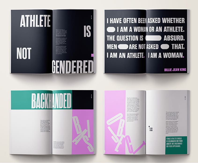 The publication series aims to put confidence and empowerment back into the argument, making readers aware that each and every sport has its own gendered problems. Each issue contains an A2 poster, both presented in a clear wrap to address the general lack of transparency on the problem, with Issue 01 solely focusing on tennis. As suggested, possible series roll out would see each issue further case study individual sports such as boxing, swimming and basketball.
