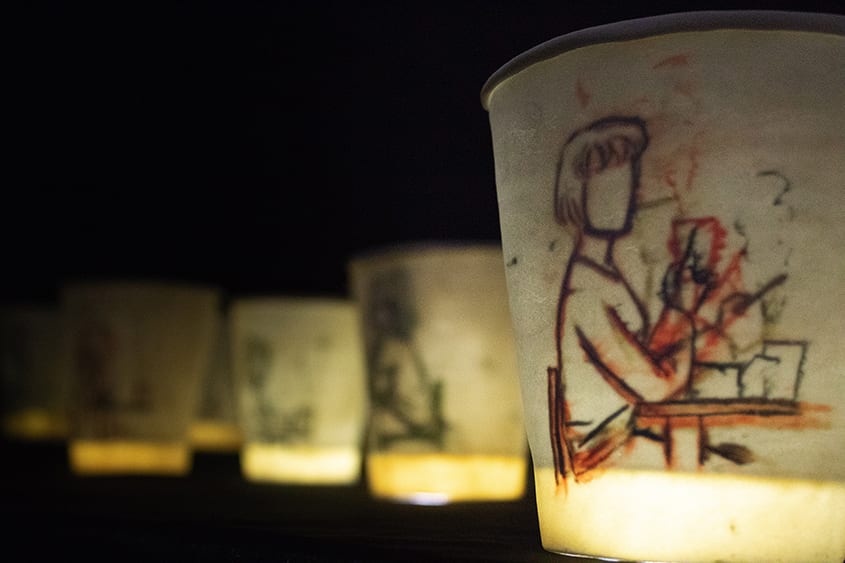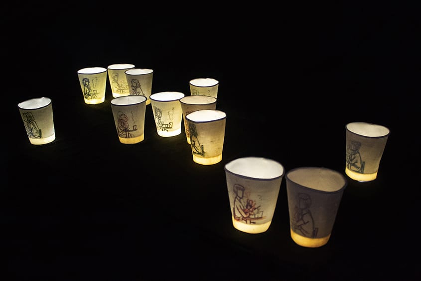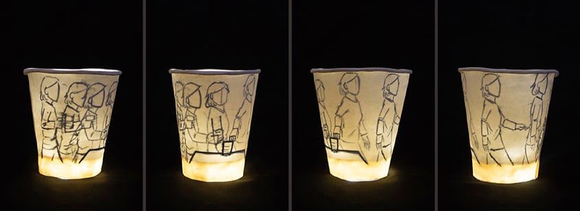 Contemporary and simple, paper canteen cups act as witness, absorbing human exchanges. Their transient nature echoes the transience of memory. Interactions with the cup become encased within it, but only until it is disposed of. My cups embody these memories and give them permanence, long after the original vessel is gone. The disposable cup gains new significance as a vessel, as preserver of precious memories, however mundane they may seem.