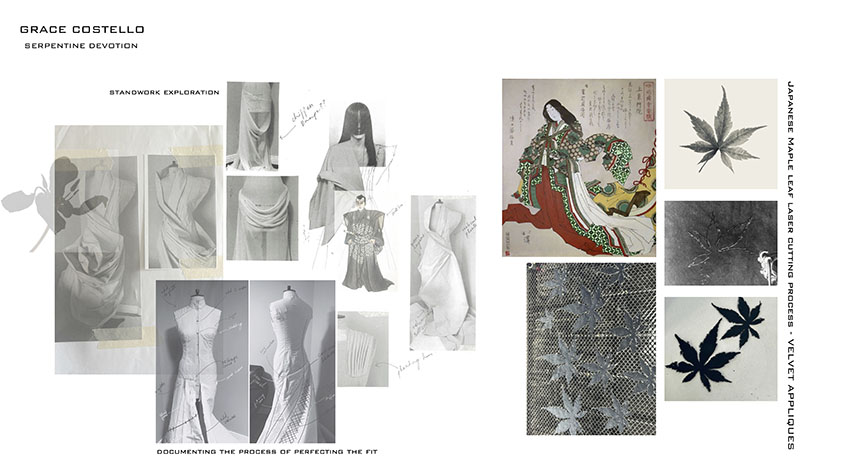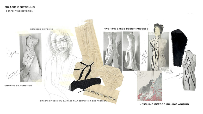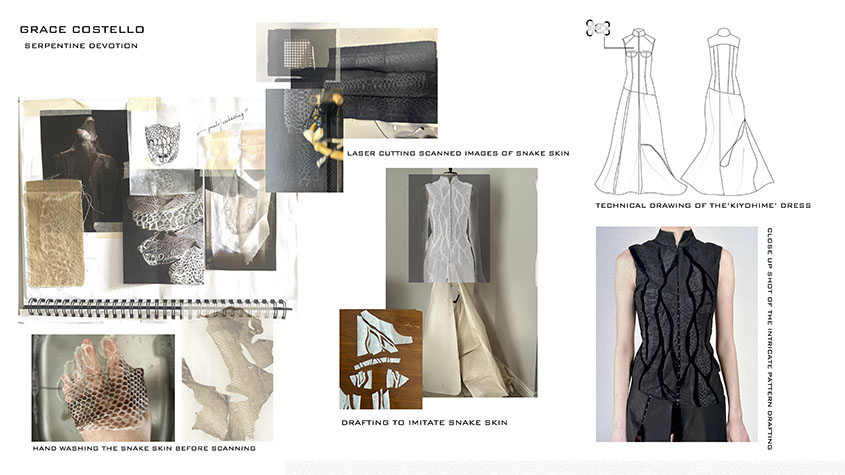 After her interest in the monk is rejected, heartbroken and consumed by grief, Kiyohime purs1MS him relentleuly, transrorming into a serpent in rage, moments before killing him in a bell, where he had hidden in the DOjO-ji temple. I wanted to translate this beautiful imagery to cloth through Oriental-style silhouettas, laser-eut snake-printed cloth and darkromantic aesthetics. I drafted my patterns to expre&11an intersection of tradition and modemfy, to create detail-oriented garments that represent beauty in darkne•. From my design work I created flat patterns for my heavy-weight fabrics. For my light sheers I used the mannequin form to drape silhouettes. I wanted to capture the