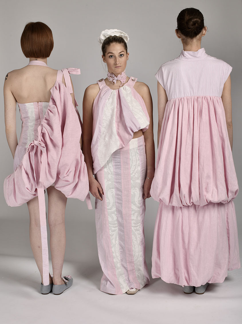 My designs derive from the chambers of the heart, the brain and the manipulation of shape on the stand. My design process is instinctual, and the soft fabrics used express the organic flow in which I works. The fabrics used are 100% linen and 100% cotton to create a gentle fall and a softness within the garments. I also used tulle to create volume within the garment. The fitted panelling and large gatherings visualise the logic of the brain fighting with the emotions of the heart. This collection is dedicated to her grandmother Maur who epitomised self-love.