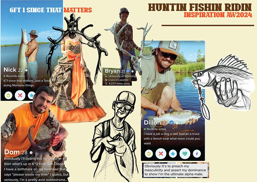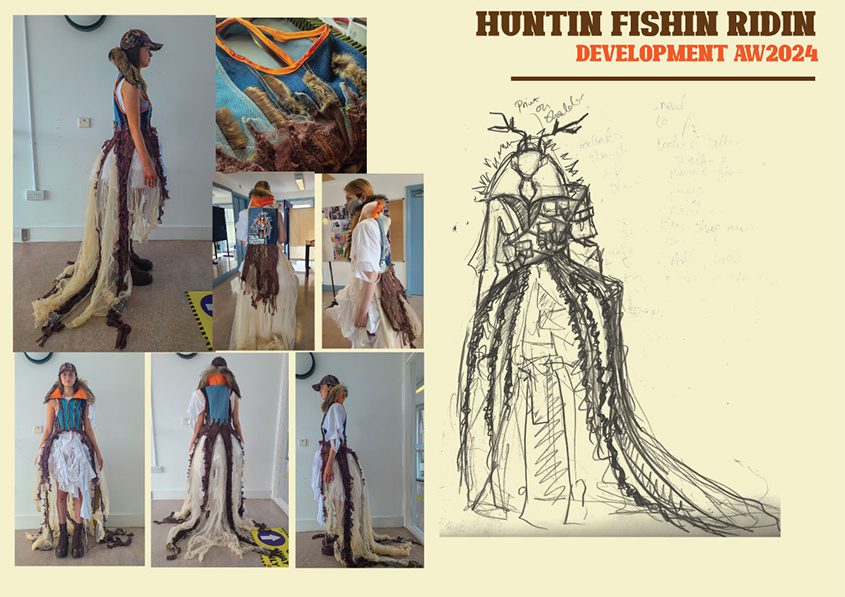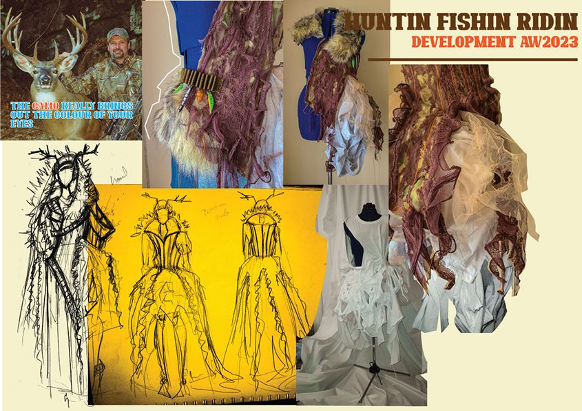 Hannah Docherty is from the Fashion Design course. For this collection she was inspired by some of the men she found on tinder, the dating app. Hannah was fascinated by the primitive urge men possess to show off a recently killed deer or a fish, in order to attract a potential mate.  The size of the kill is an extension of his masculinity. She explores this concept with a sense of humour and curiosity. Hannah combines this satire of hypermasculinity with traditionally ultra-feminine silhouettes and materials. She has created a collection for the ultimate trophy prize.  She burns and distresses layers of tulle mesh and satin to create “trashy couture”. Denim, camouflage and white t-shirts are traditionally functional masculine materials but through manipulation they become purely for aesthetics. Hannah enjoys using non traditional fashion embellishments such as the fishing baits and wire.