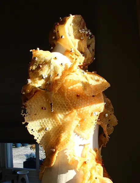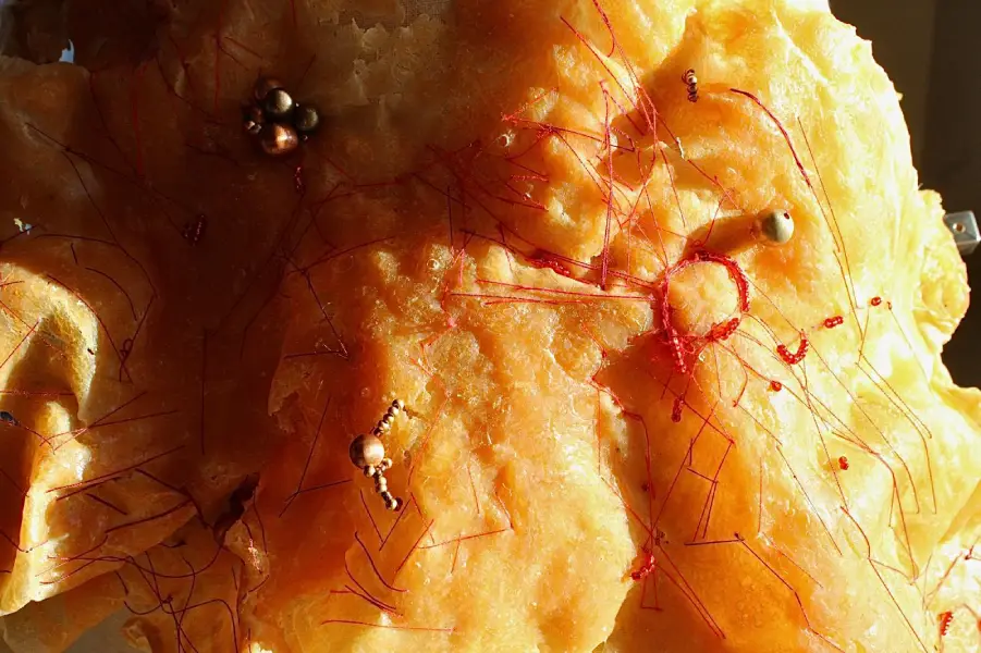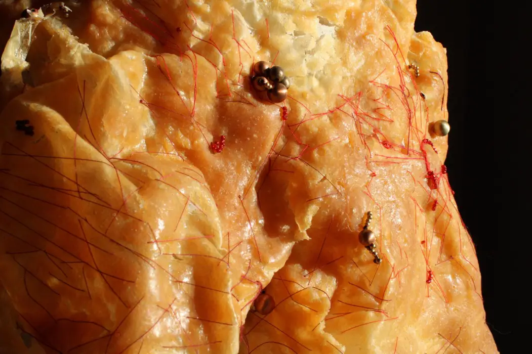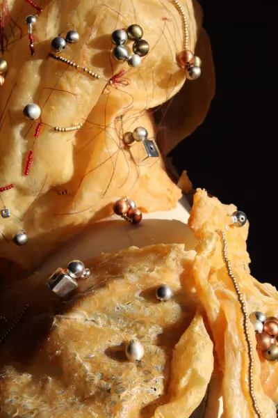 This work explores the emotional and physical experience of living in one’s own skin, with a particular focus on acne, inherited beauty standards, and the weight of generational femininity. Through a wearable latex sculpture—a kind of “second skin”—I visualized the tension between protection and exposure. The latex material was pierced with hand-stitched beads and pearls, referencing the sharp visibility of acne and the inherited rituals of beautification.
