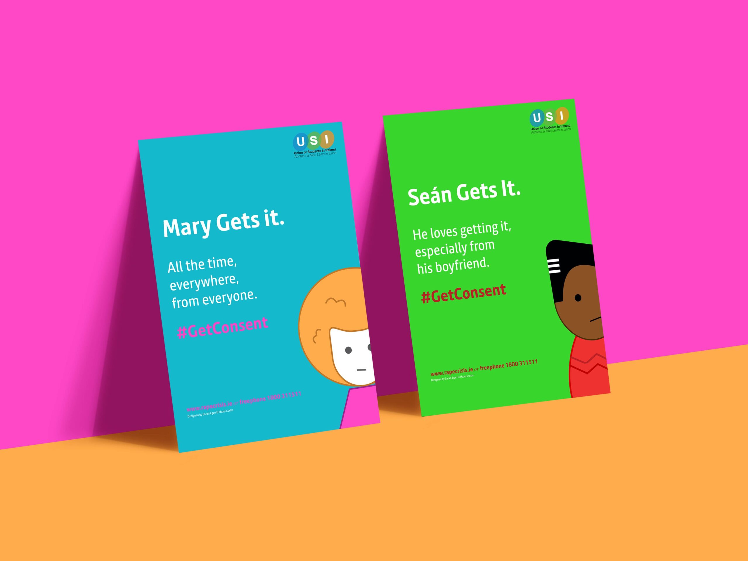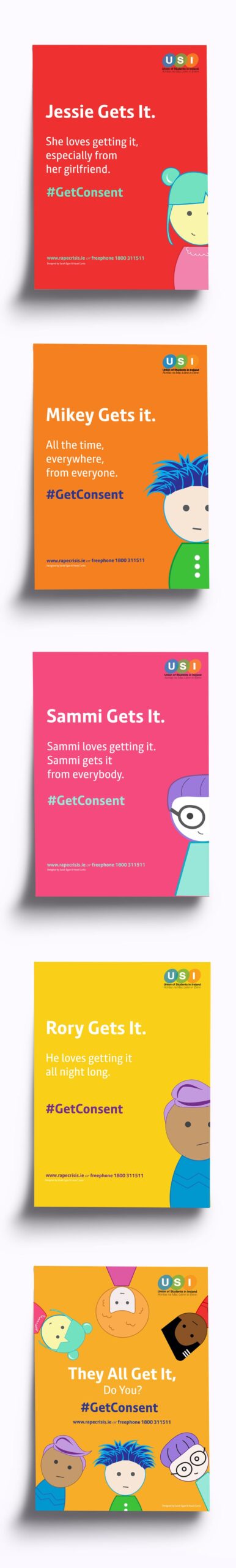 The posters are bright, lively and eye-catching to create a friendly atmosphere and to break down the stigma attached to the issue of consent. The posters play on the innuendo of “getting it” while the hashtag reveals the unexpected double meaning, addressing the issue of consent.