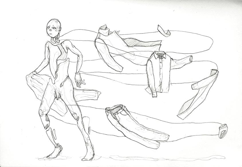 Having no anchor, or real place to call ‘home’, the elements of the ‘walking wardrobe’ become one’s improvised, immediate shelter.