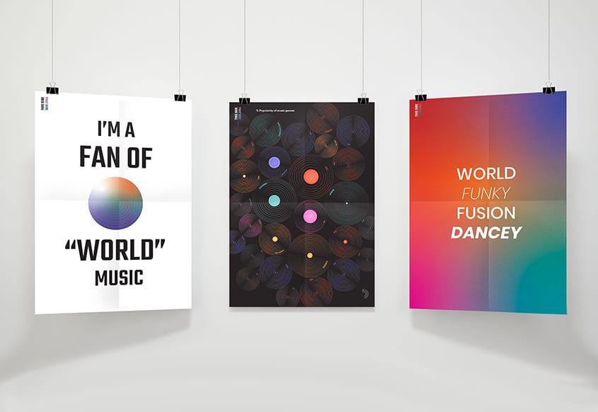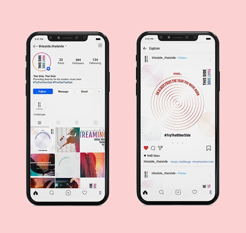 This campaign positively promotes the idea of diversity in music. This Side, That Side consists of an informative publication, along with a poster series, and an engaging and interactive social media campaign. The publication itself is a 40-page booklet of gathered research on the topic of diversity as well as results from my own conducted survey, revealing the true nature of music fans listening habits. The social media campaign includes motion graphics and music discovery challenges for music lovers to take part in. The posters also act as a reminder to music fans to be more conscious of diversity.